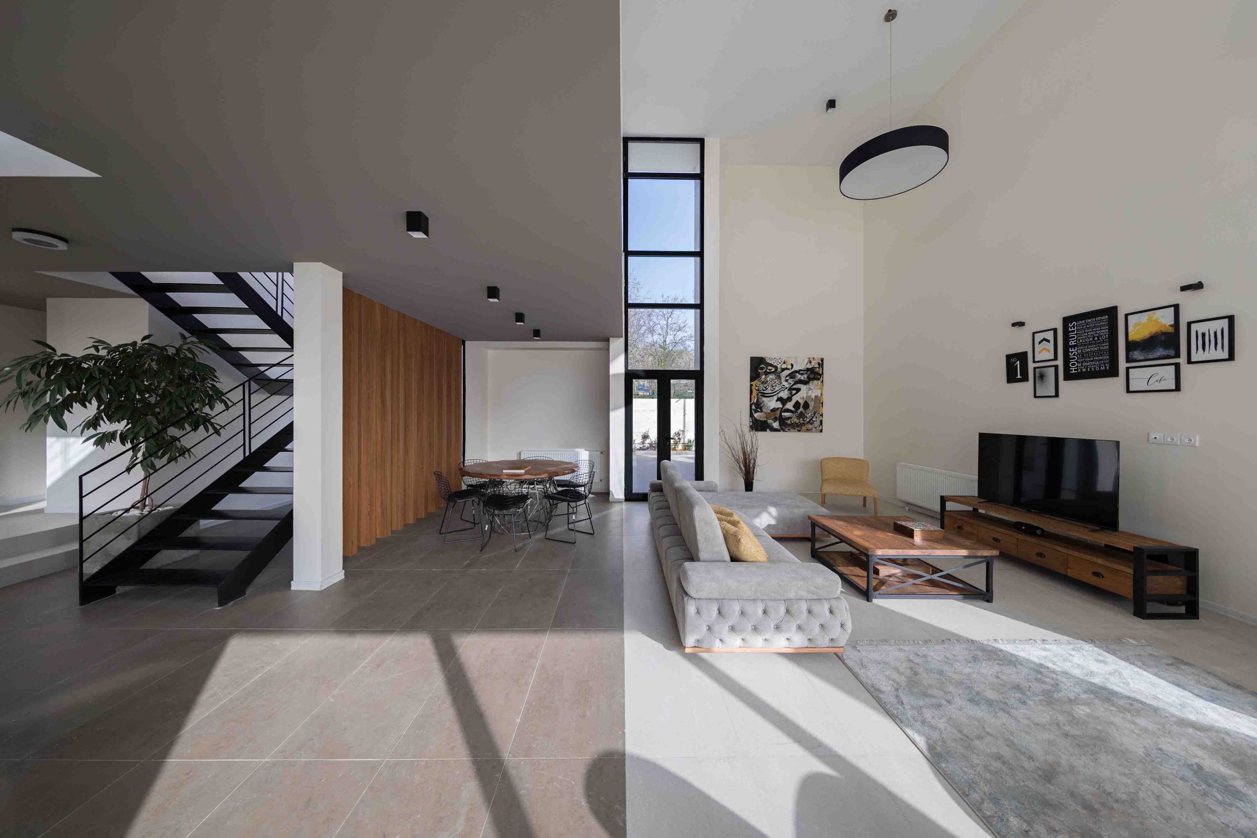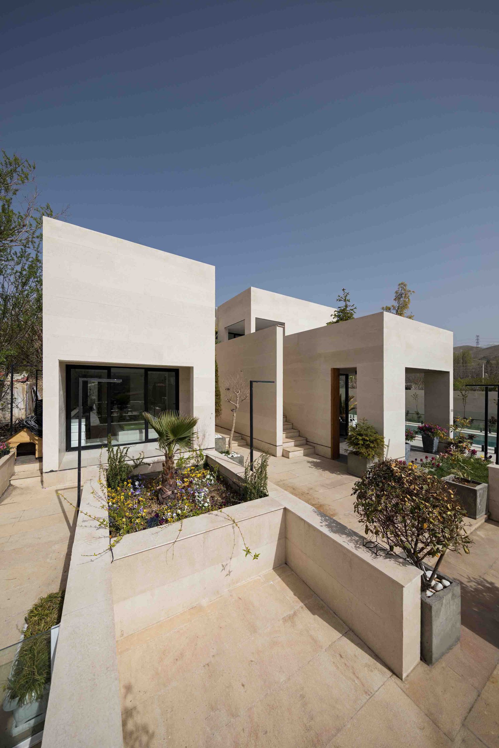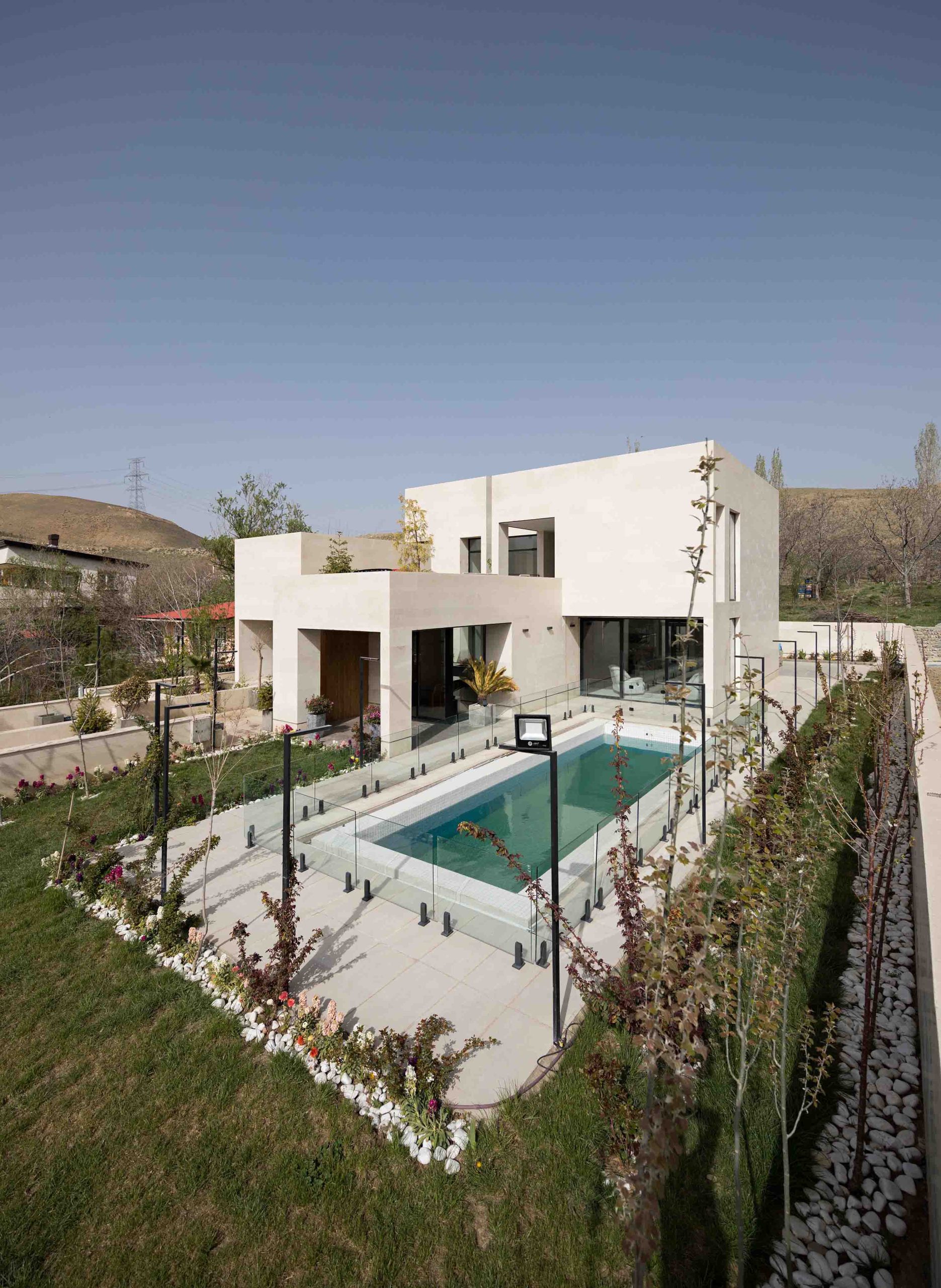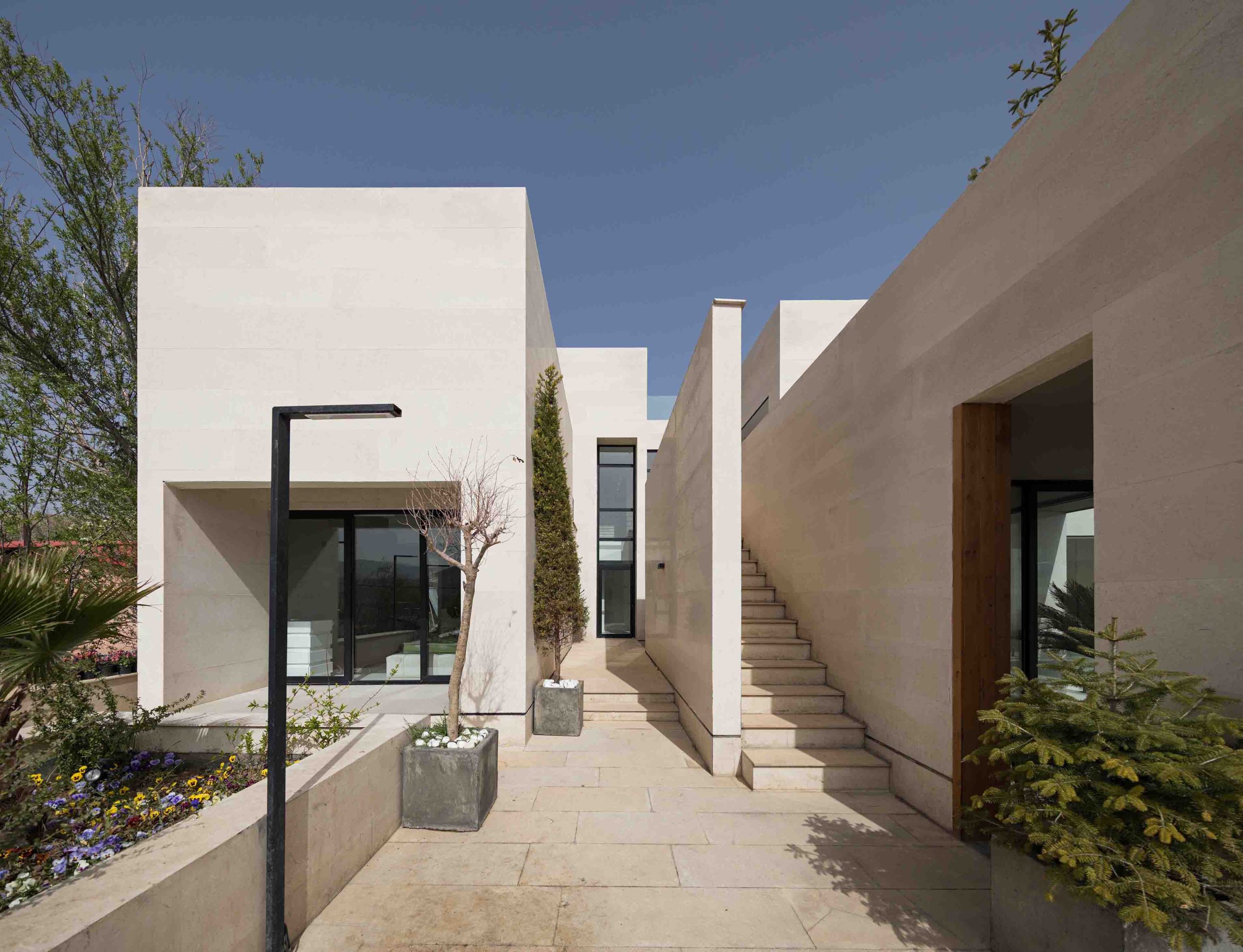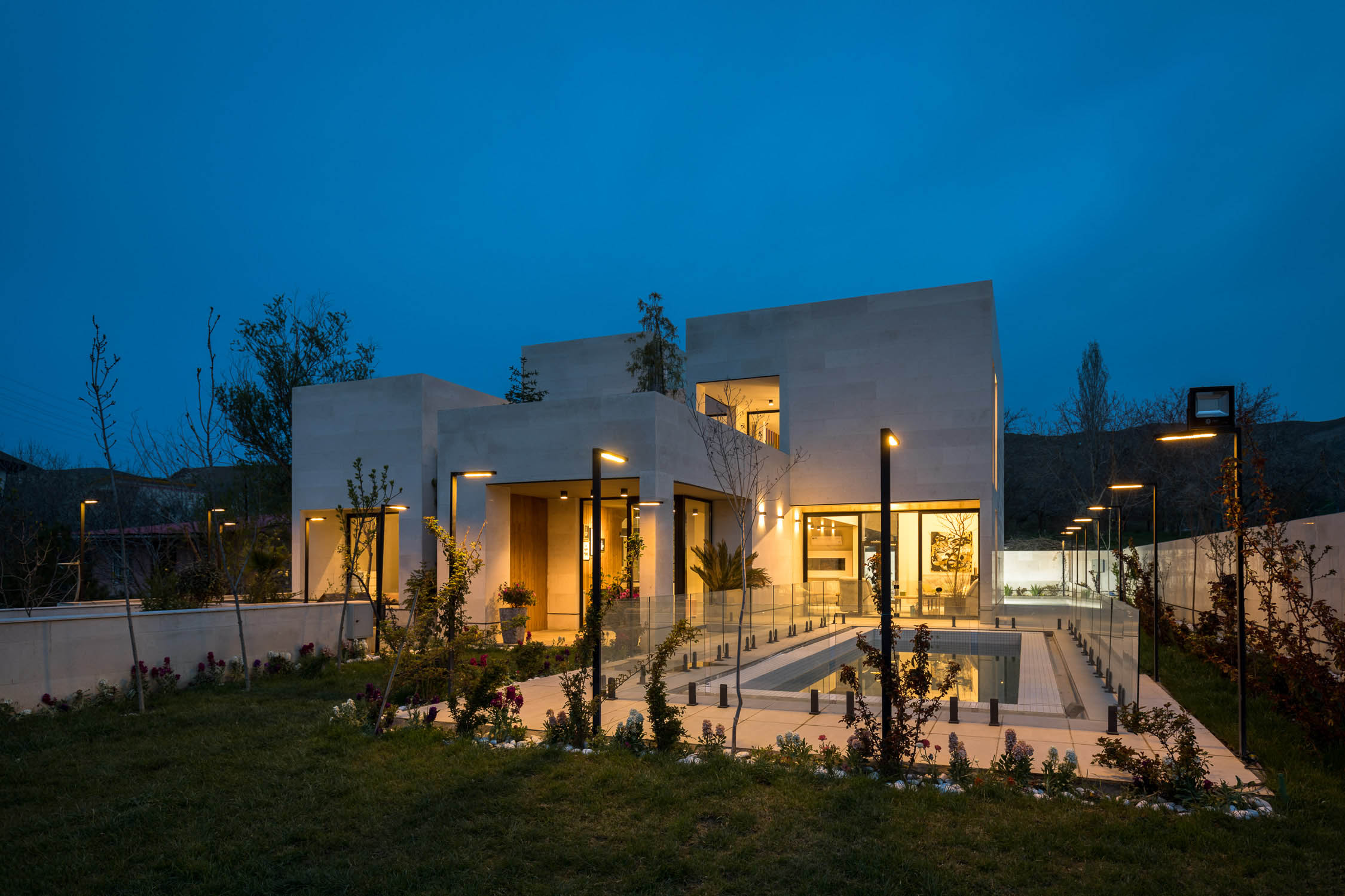 نمای شب ویلای دوبلکس با طراحی مدرن مکعبی، نورپردازی گرم، مسیر سنگی و حیاط سرسبز با المان‌های معمارانه و گیاهان تزیینی