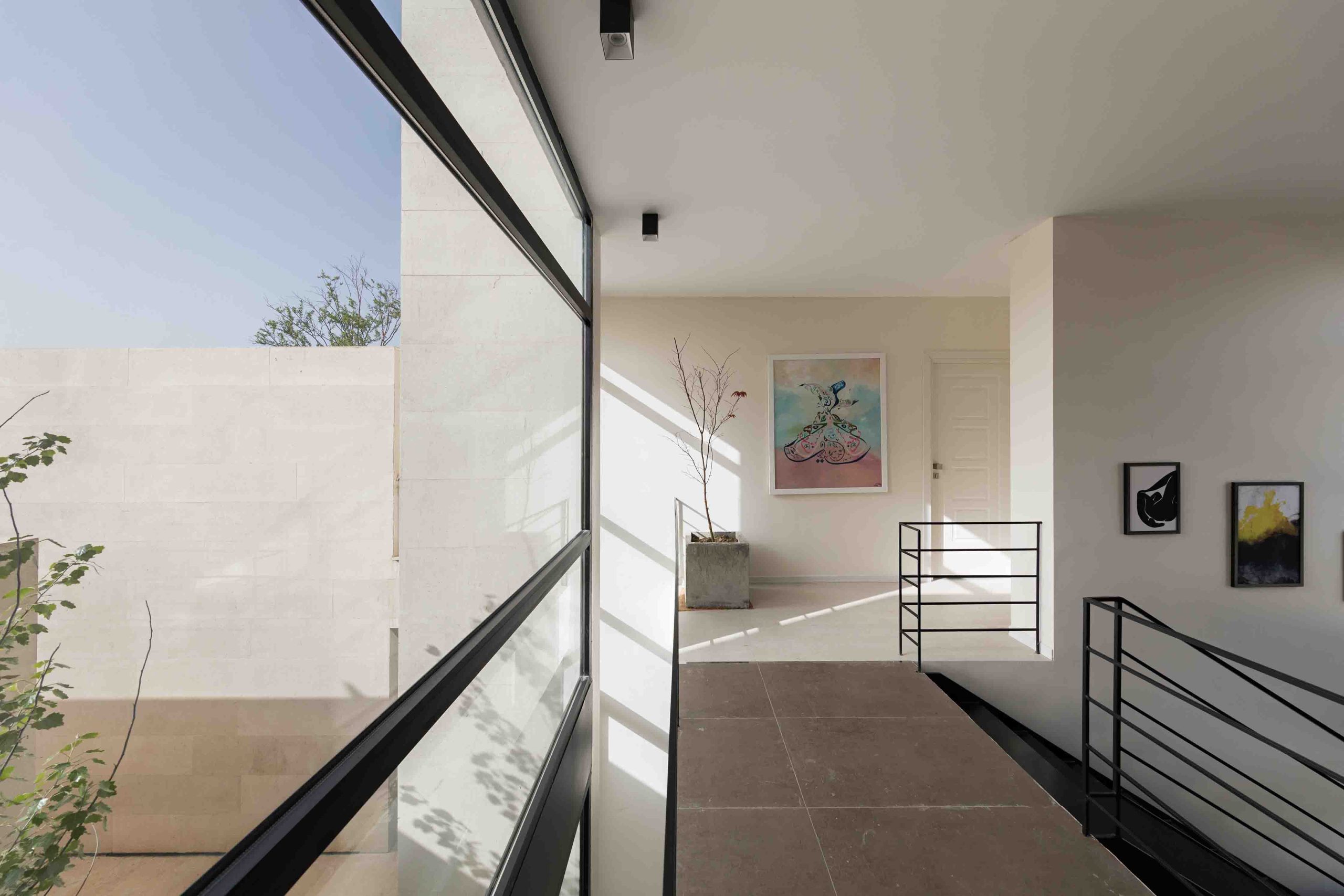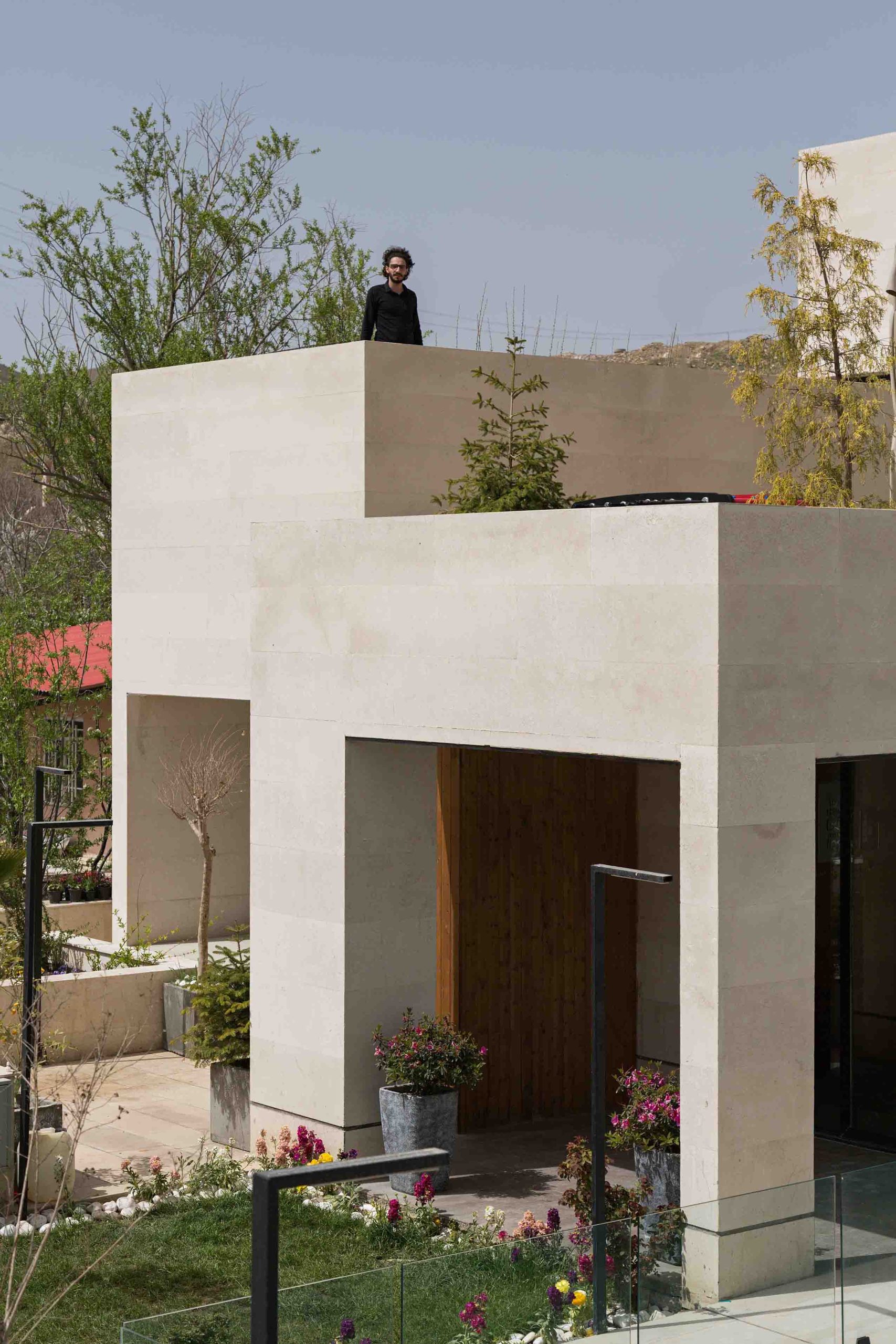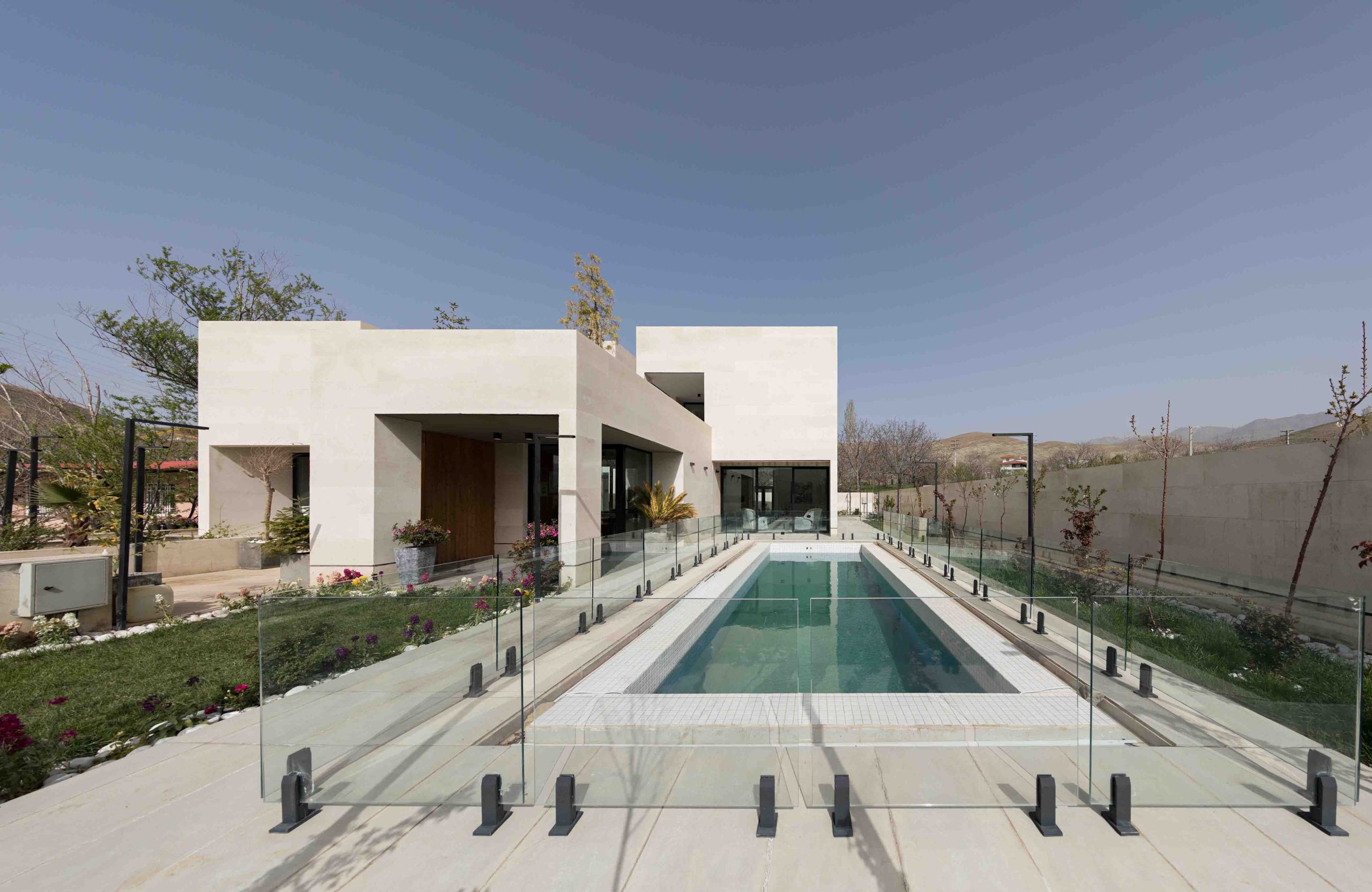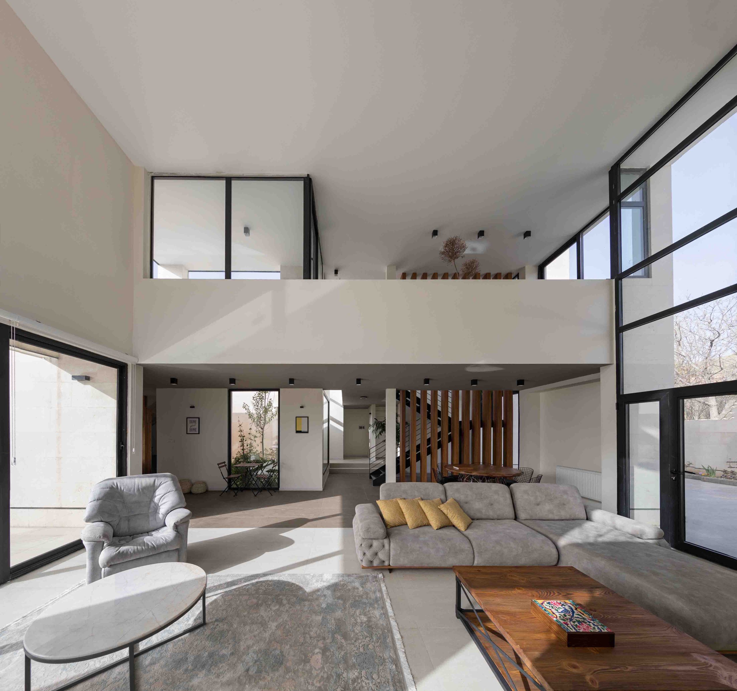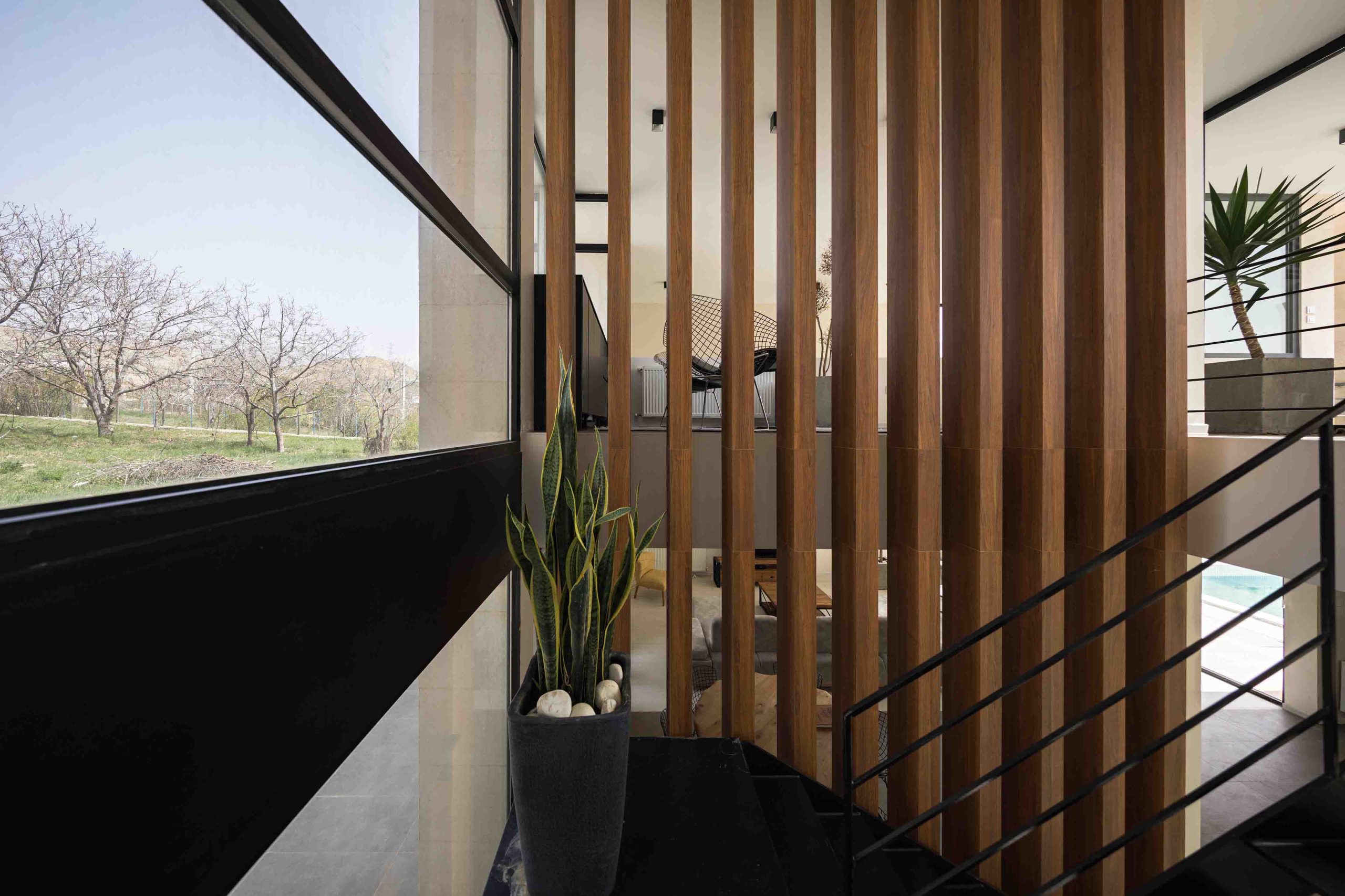 نمای شب ویلای دوبلکس با طراحی مدرن مکعبی، نورپردازی گرم، مسیر سنگی و حیاط سرسبز با المان‌های معمارانه و گیاهان تزیینی
