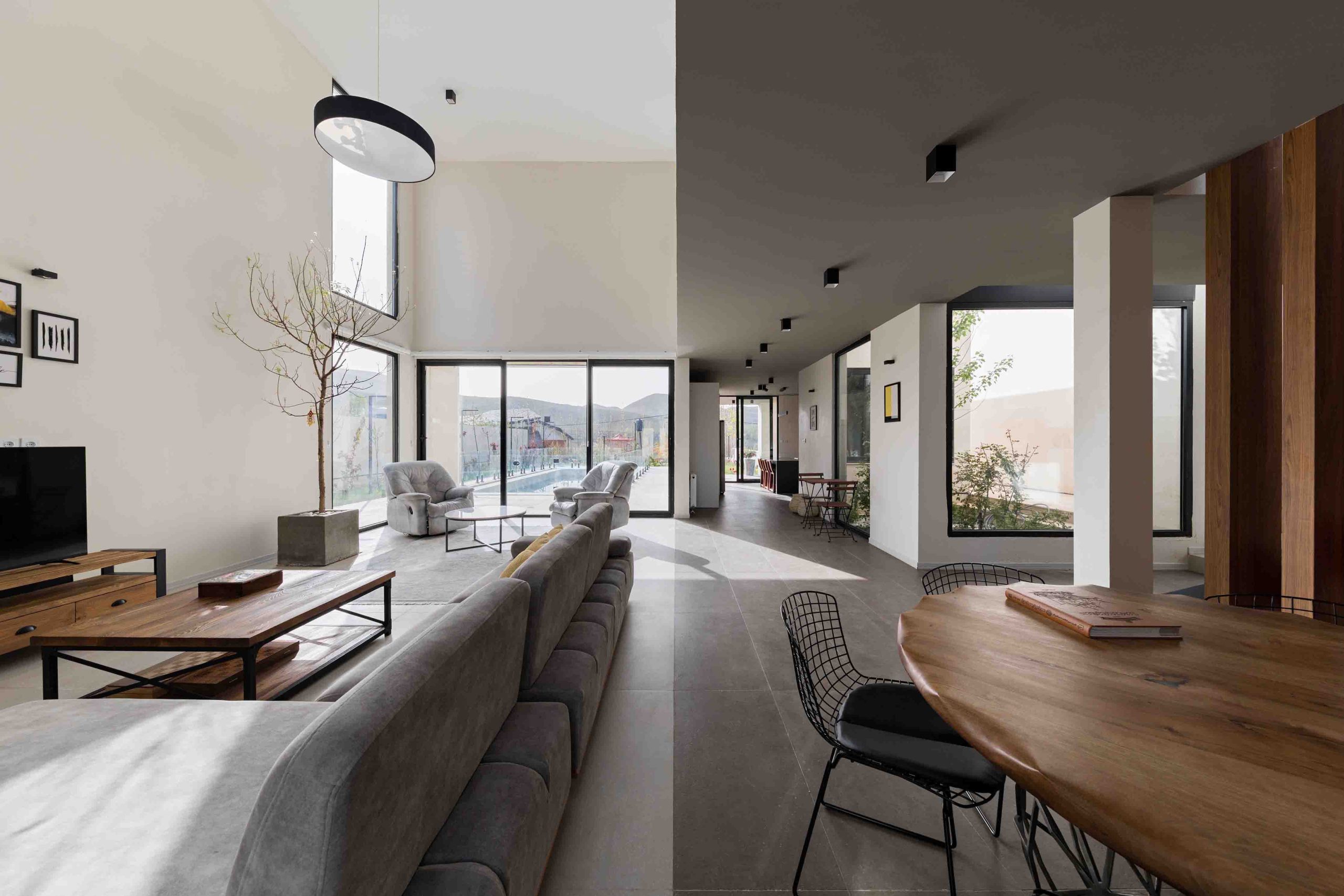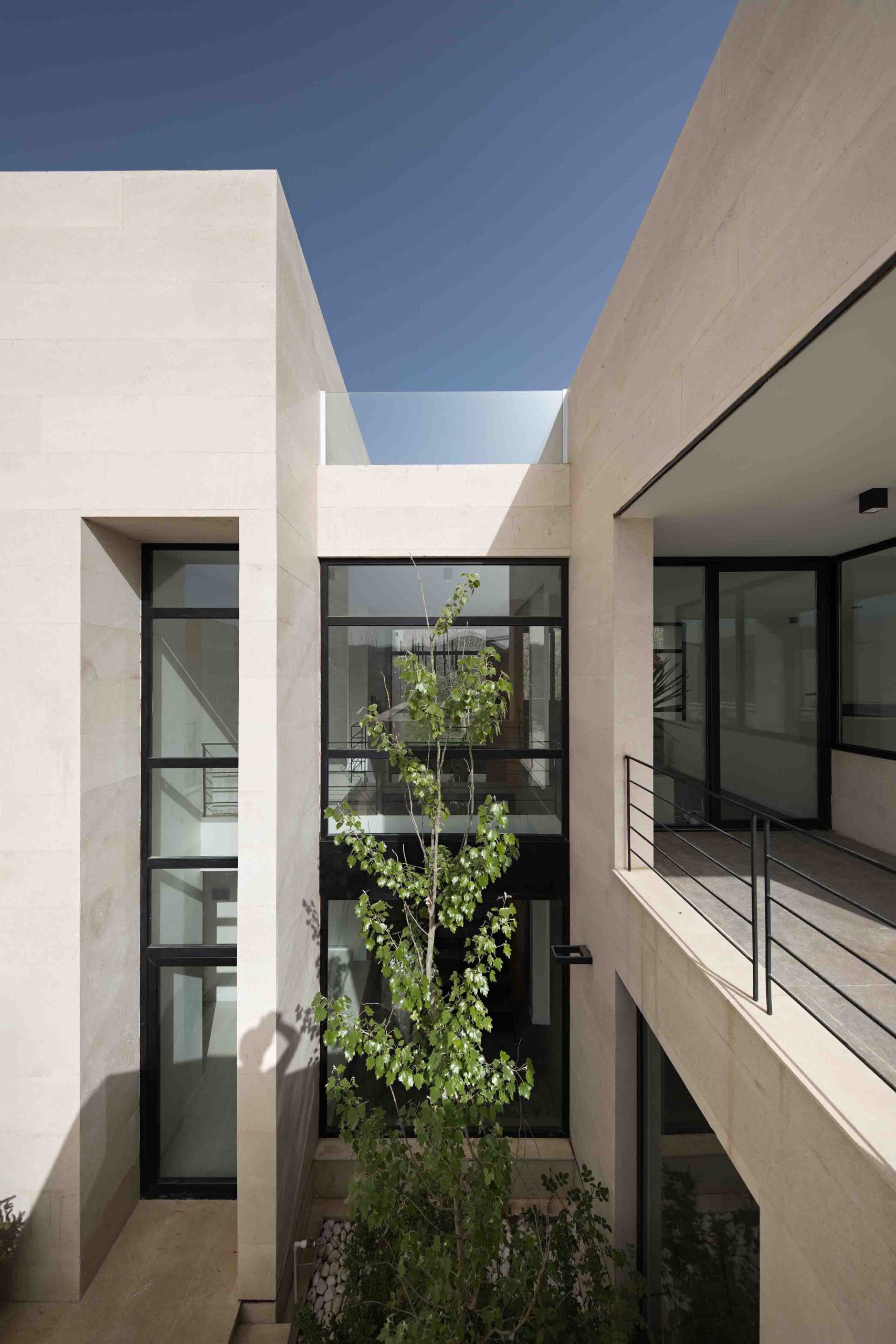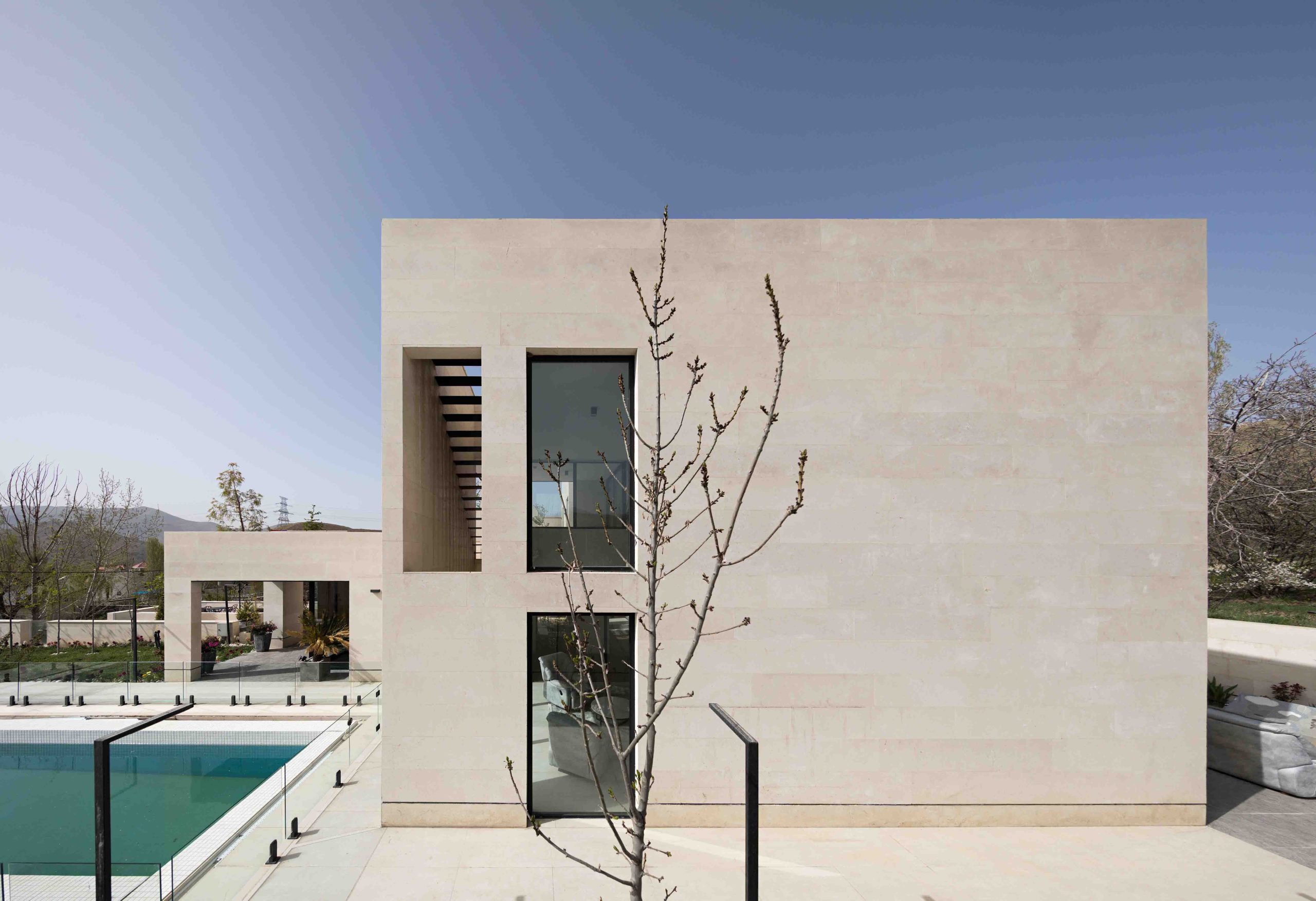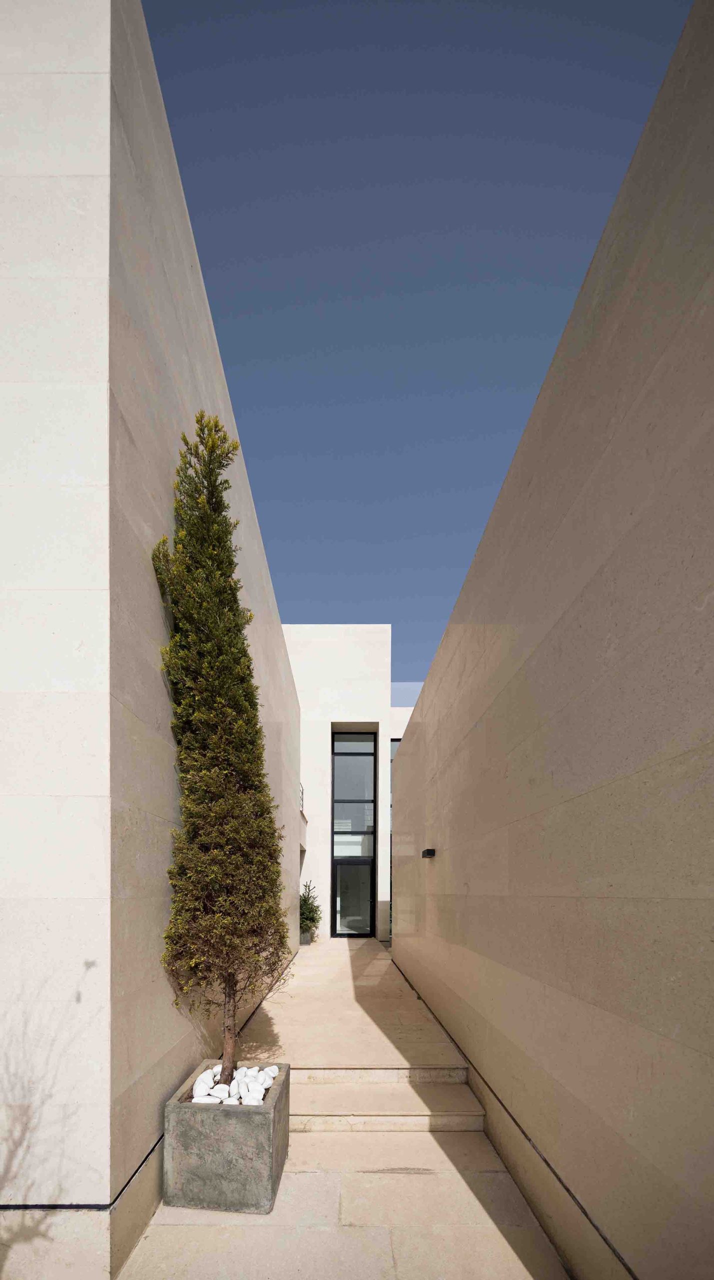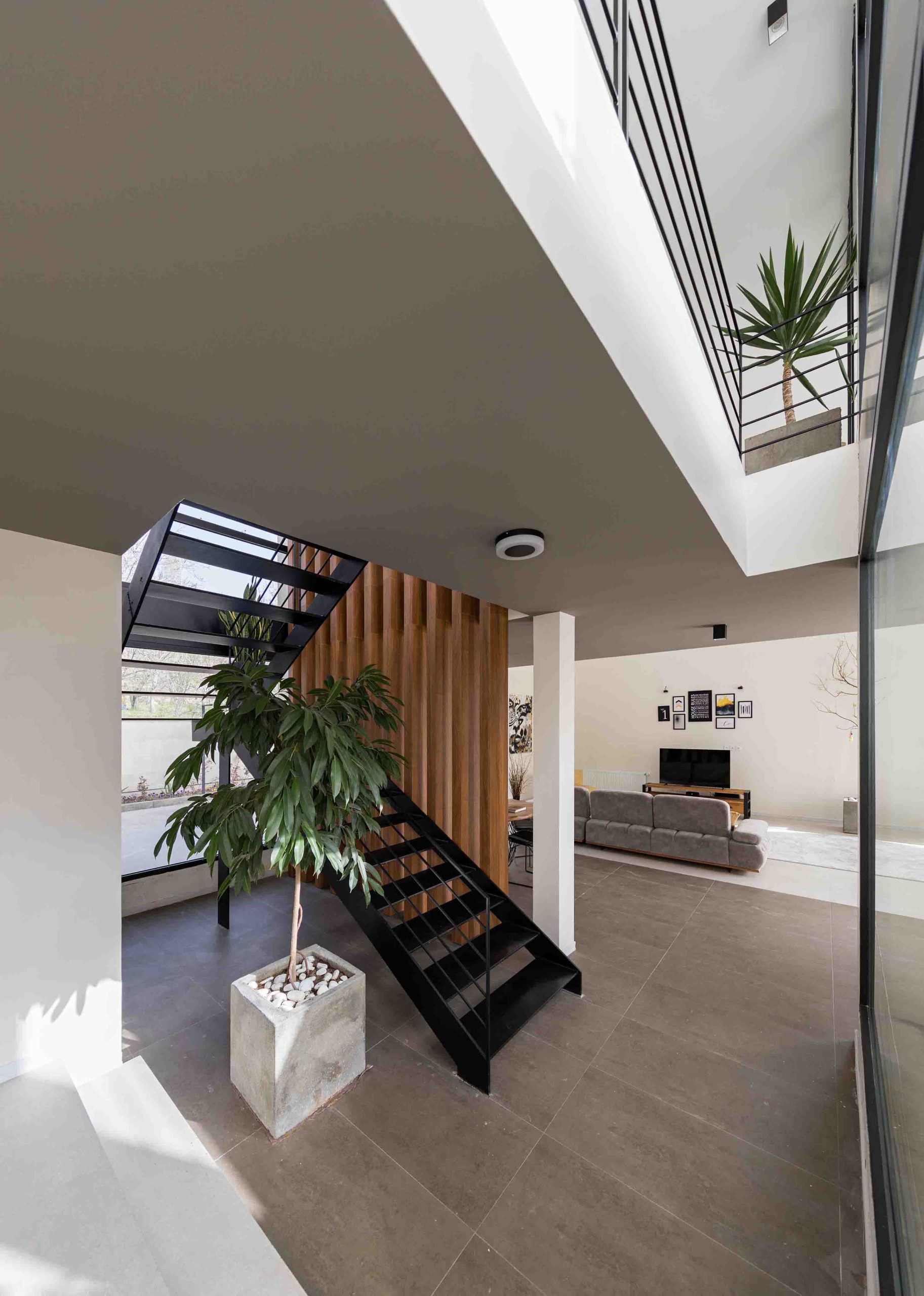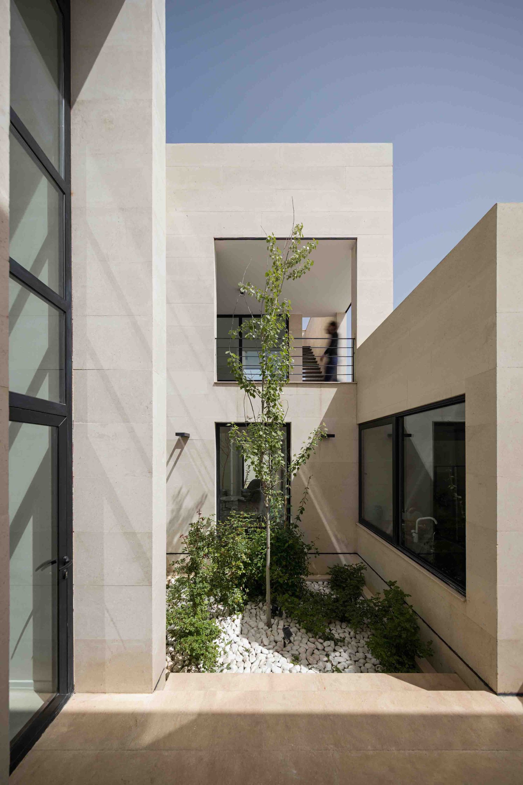 نمای شب ویلای دوبلکس با طراحی مدرن مکعبی، نورپردازی گرم، مسیر سنگی و حیاط سرسبز با المان‌های معمارانه و گیاهان تزیینی