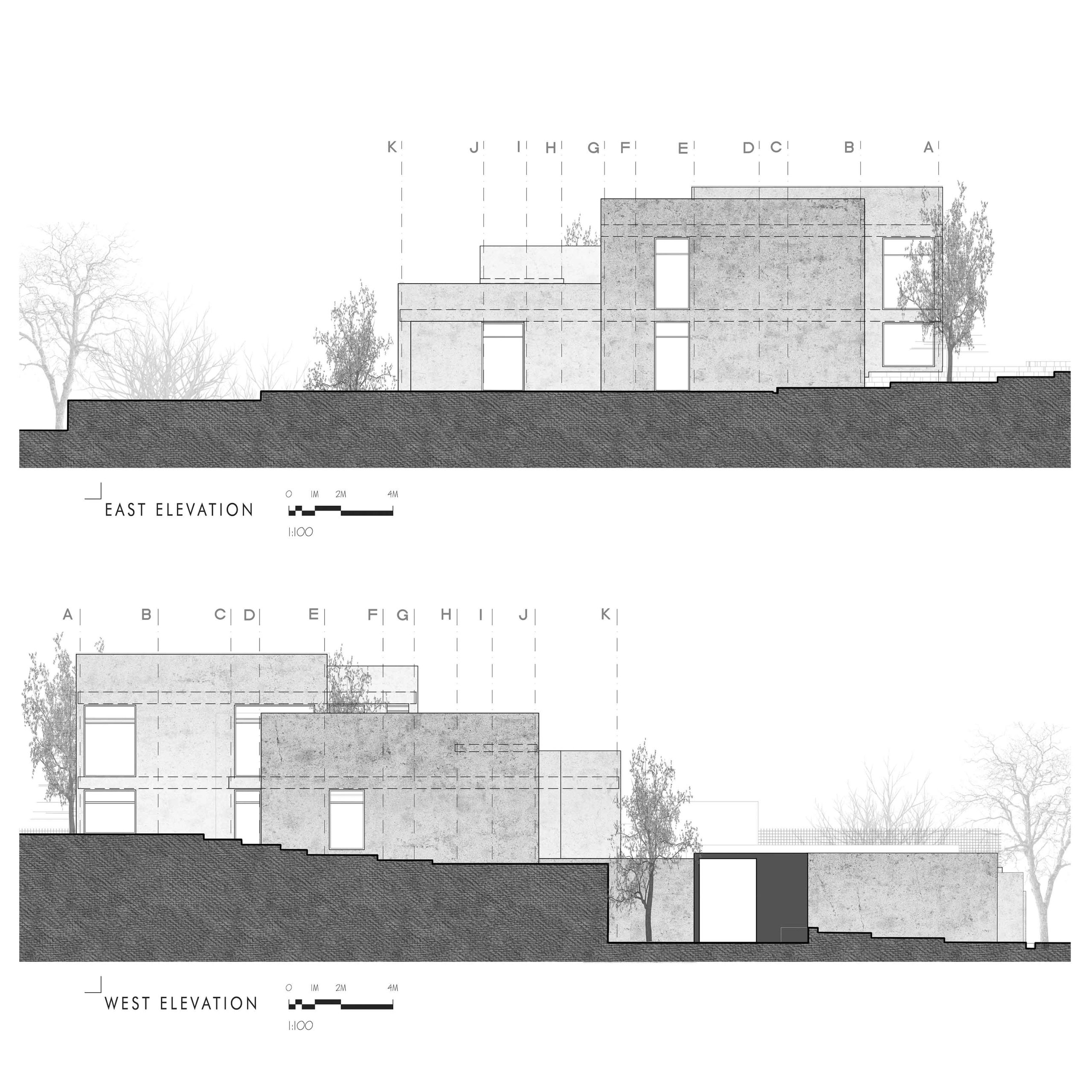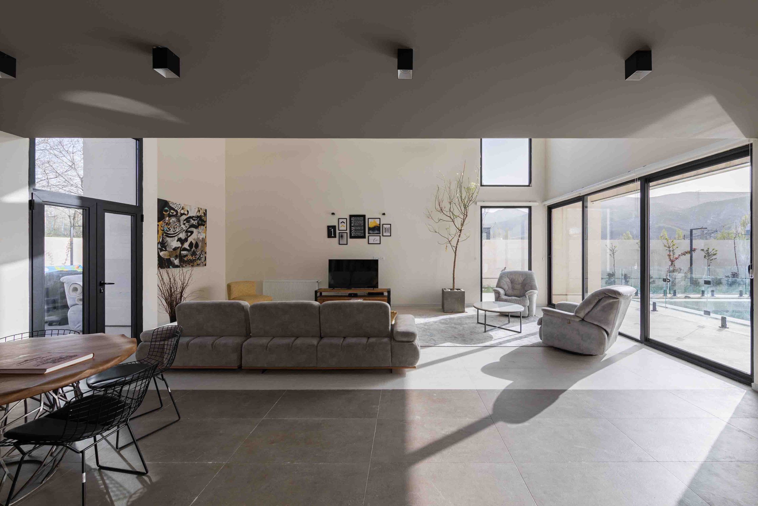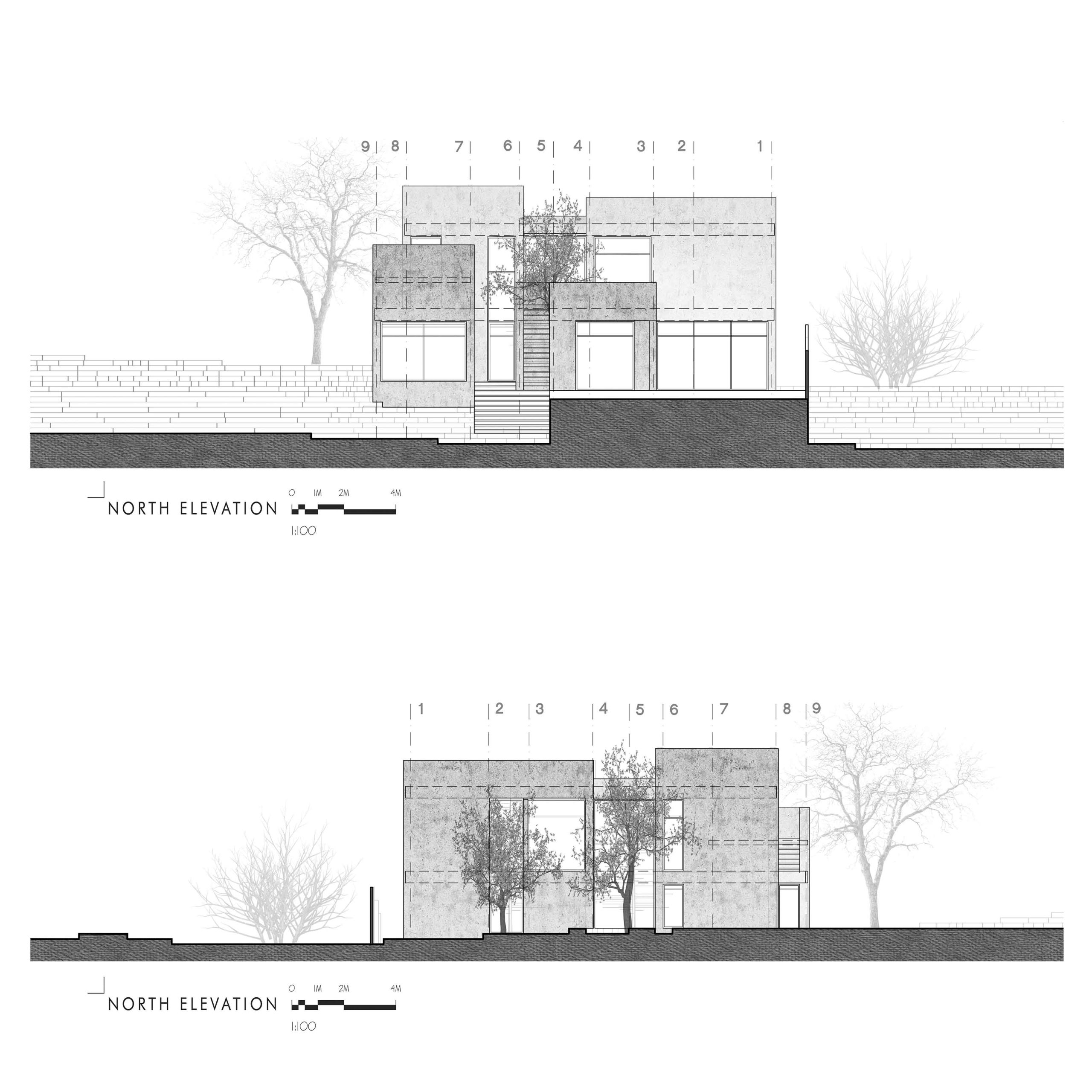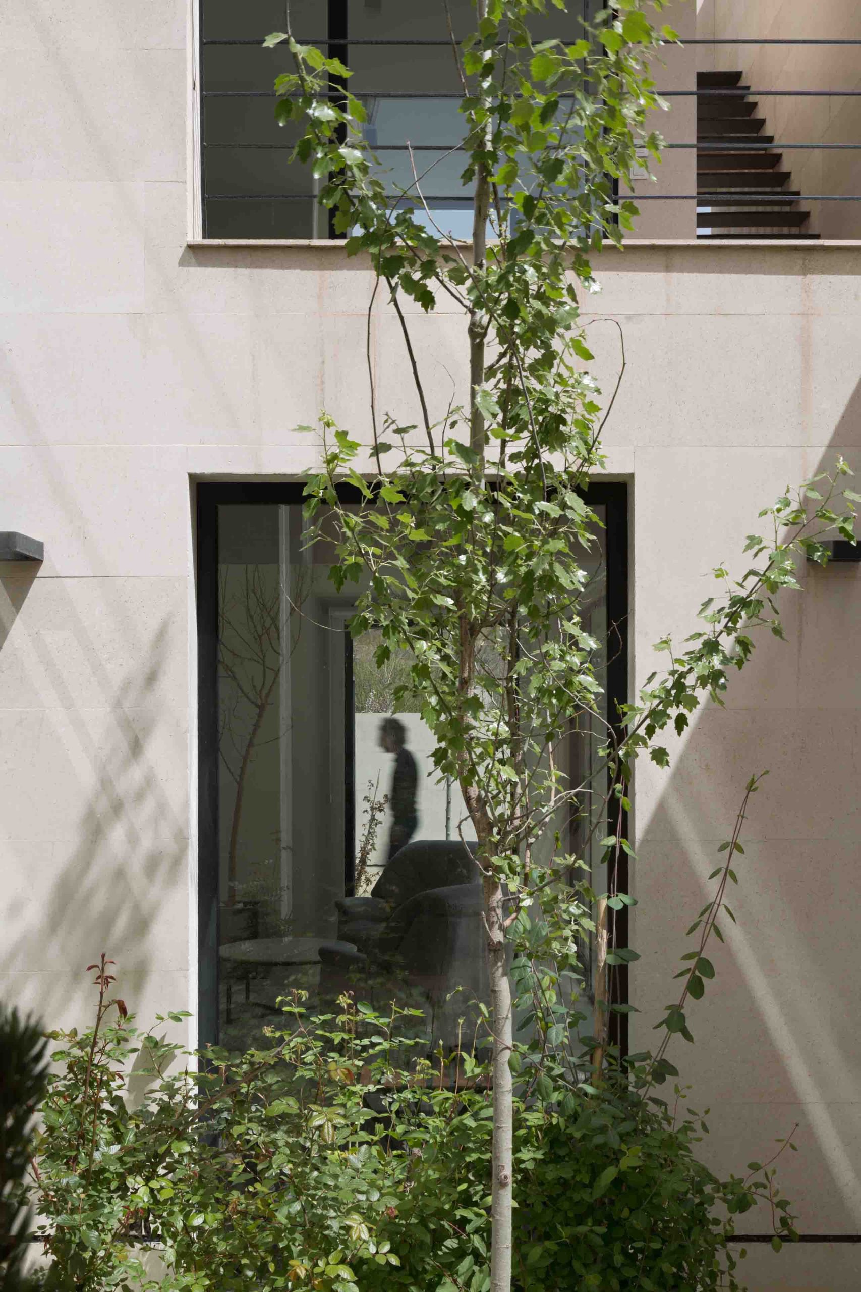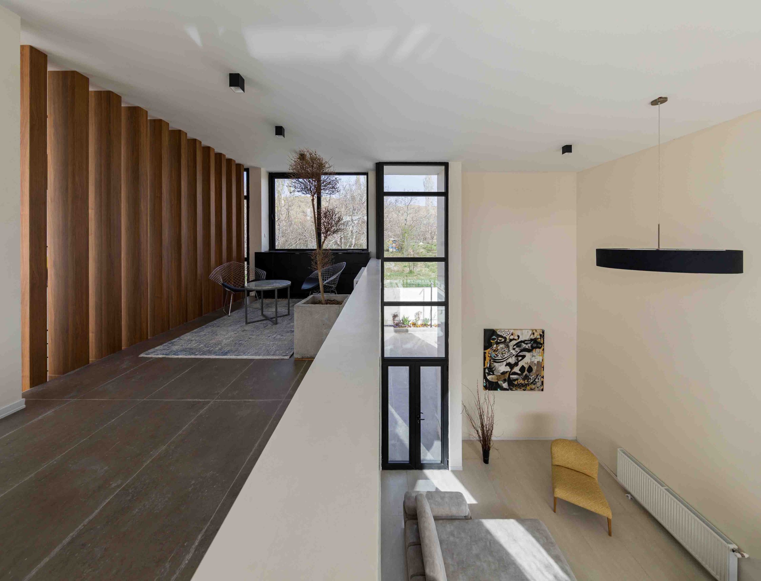 نمای شب ویلای دوبلکس با طراحی مدرن مکعبی، نورپردازی گرم، مسیر سنگی و حیاط سرسبز با المان‌های معمارانه و گیاهان تزیینی