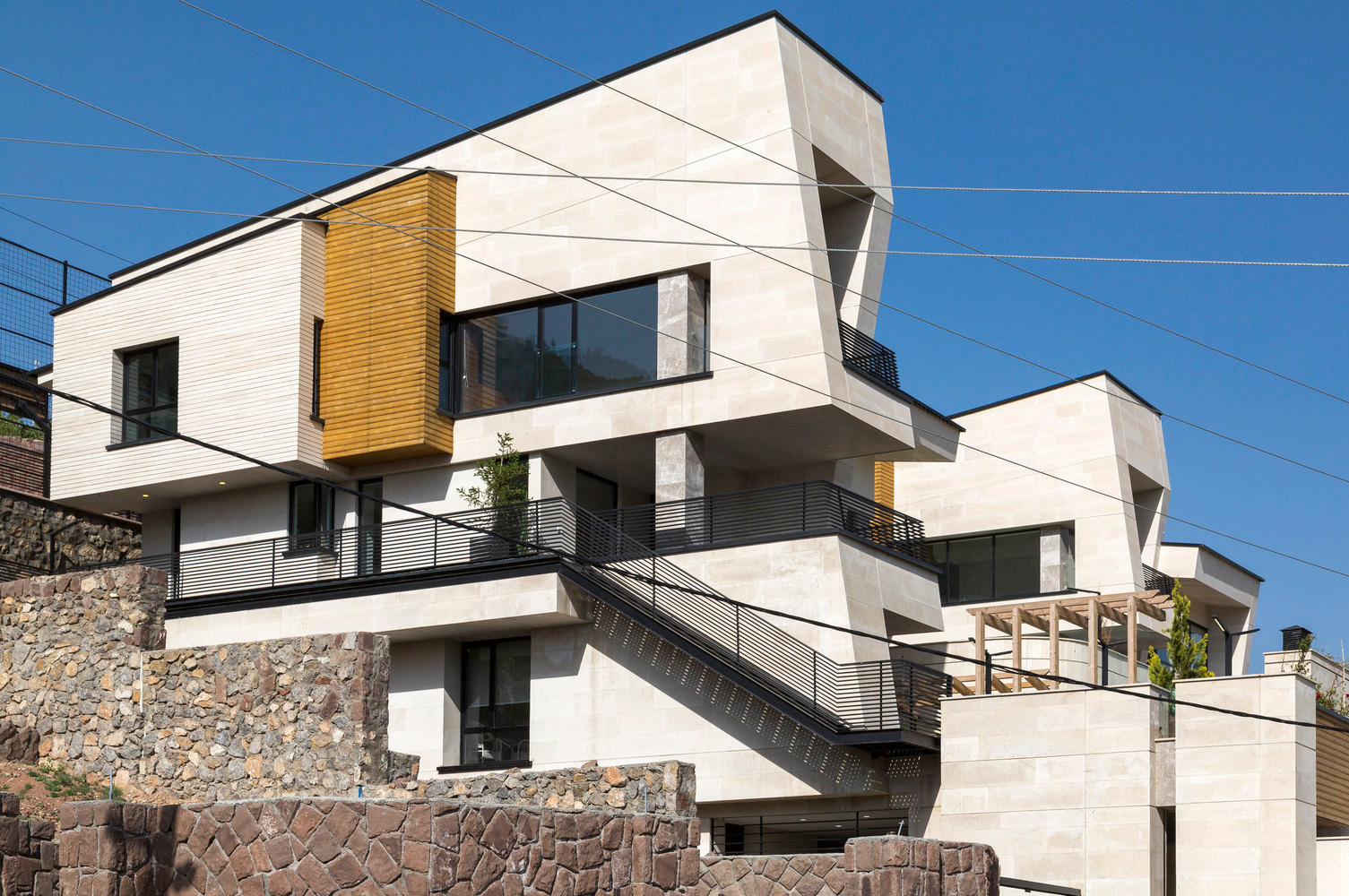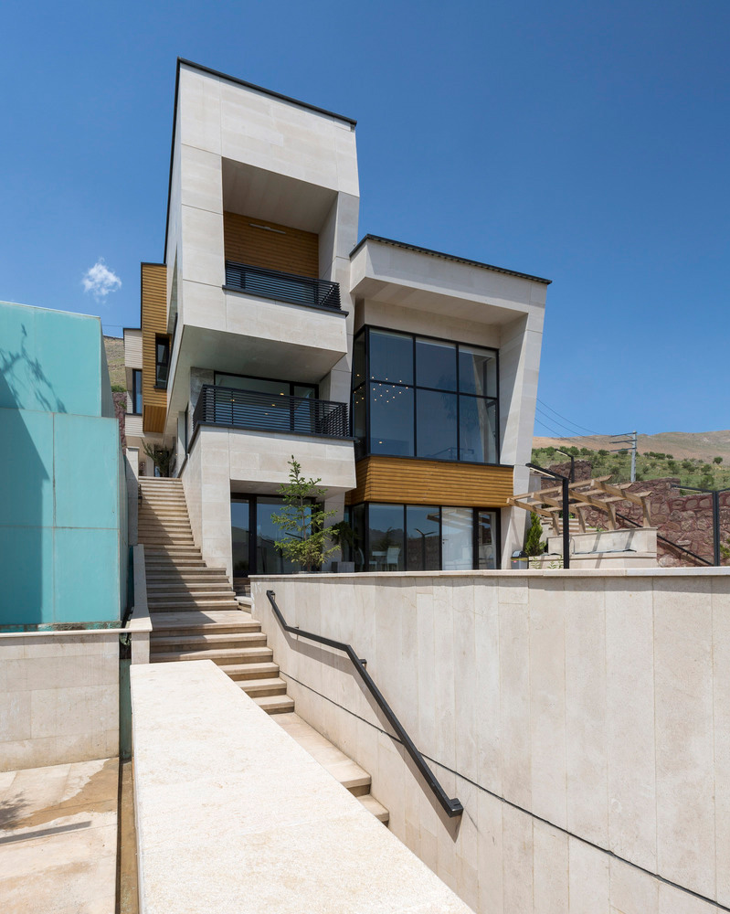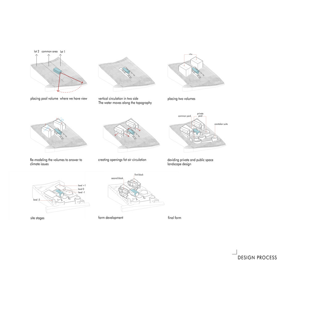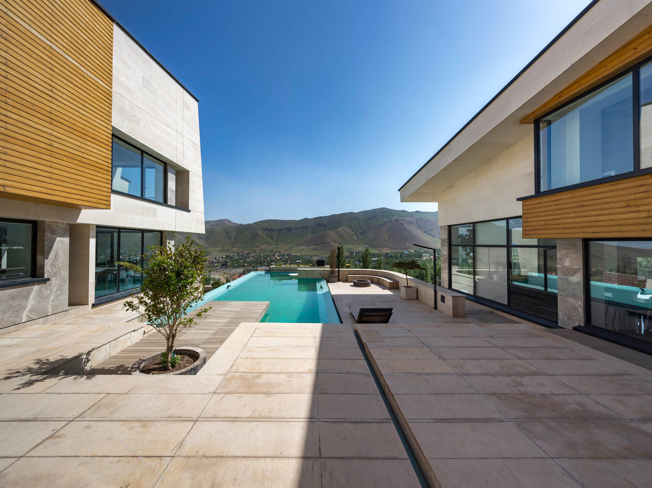 <p dir="rtl">الهام‌گیری از معماری بومی همواره چالشی جدی برای معماران است. در این پروژه، نگاه ما صرفاً فرمی نبود، بلکه تلاش کردیم «حس و ذائقه معماری بومی ایران» را در بستری مدرن بازآفرینی کنیم.<br><br>از سوی دیگر، خواسته کارفرما طراحی دو ویلای مستقل در یک زمین مشترک بود. با تعریف یک حیاط مرکزی مشترک و طراحی پله‌هایی محصور که انرژی سایت را در خود جذب می‌کنند، سطوح مختلفی در سایت شکل گرفت که به فضاهایی باز، نیمه‌باز، خصوصی و عمومی متنوع منتهی شد. این نگاه ویژه به بستر سایت، باعث ایجاد نوعی هم‌زیستی، همراهی و همسایگی میان دو ویلا شد.<br><br>این پروژه بر روی زمینی به مساحت ۲۰۰۰ متر مربع و با شیب ۴۰٪ اجرا شده است. در آغاز طراحی، مهم‌ترین چالش تعیین نحوه‌ی تقسیم‌بندی زمین بود. مطابق خواسته کارفرما، سایت به سه بخش تقسیم شد و بخش میانی به‌عنوان فضای مشترک میان دو ویلا در نظر گرفته شد. در این بخش، یک استخر به‌عنوان عنصر شاخص طراحی قرار گرفت و دو مسیر پله که ستون فقرات پروژه و مرزهای جداکننده‌ی دو ویلا هستند، به سایت شکل دادند. این پله‌ها پایین‌ترین و بالاترین سطح زمین را به یکدیگر متصل می‌کنند.<br><br>دو ویلا در سمت چپ و راست سایت به‌گونه‌ای قرار گرفتند که حیاط و پله‌ها را در آغوش گرفته‌اند. فضاهای عمومی ویلاها رو به حیاط مشترک هستند و فضاهای خصوصی به سمت مناظر اطراف. بر اساس این تقسیم‌بندی، هر بلوک از سه تراز اصلی تشکیل شده است. پله‌های سایت به پاگردهایی در هر تراز می‌رسند که به حیاط‌هایی در مقابل بازشوهای ویلا منتهی می‌شوند.<br><br>شیب زیاد سایت، امکان جاری شدن آب را فراهم کرده است. آب باران از طریق مسیرهایی طبیعی حرکت کرده و در حوضچه‌هایی در پایین‌ترین نقطه زمین ذخیره می‌شود.<br><br>سقف‌ها در جهات مختلف شیب‌دار طراحی شده‌اند و بازشوهای وسیع، پاسخگوی شرایط اقلیمی پروژه هستند. این بازشوها بیشترین دید ممکن را از داخل به بیرون و بالعکس ایجاد می‌کنند و در عین حال، حریم بصری مناسبی برای فضاها به وجود آورده‌اند.</p>