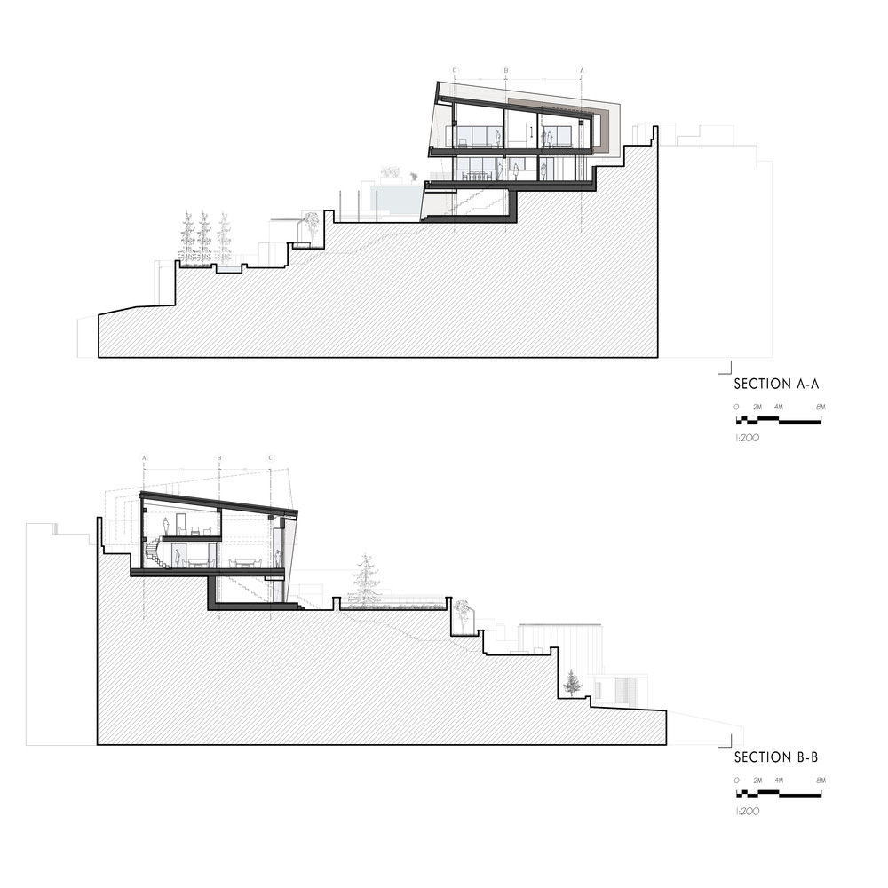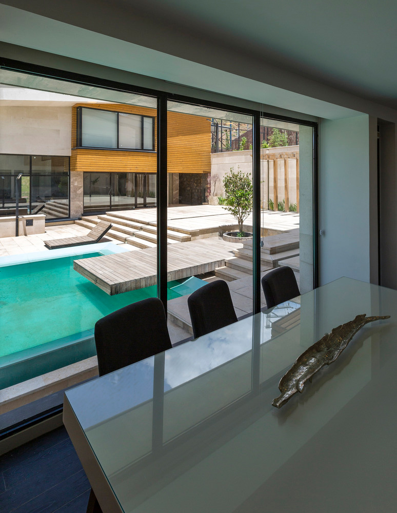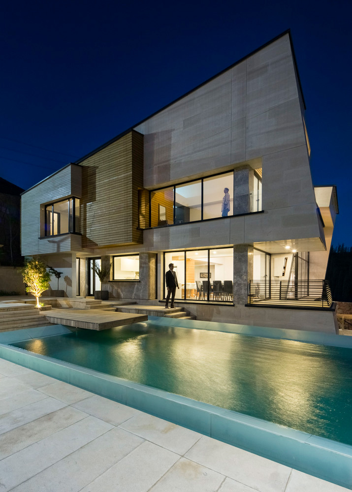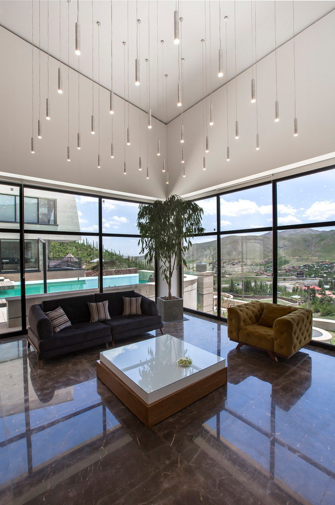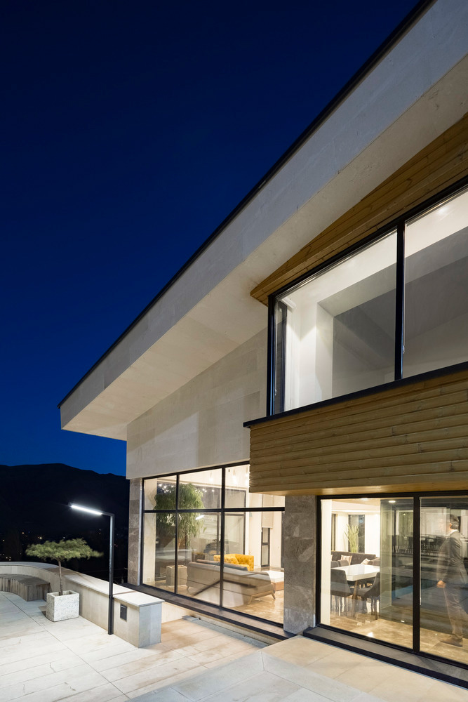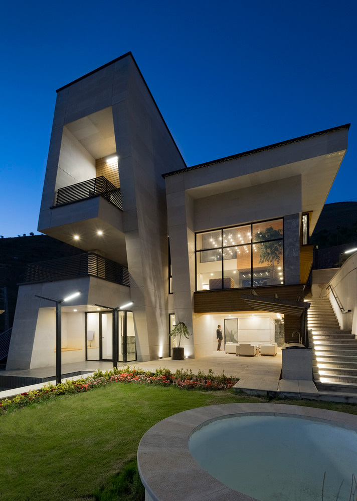 <p dir="rtl">الهام‌گیری از معماری بومی همواره چالشی جدی برای معماران است. در این پروژه، نگاه ما صرفاً فرمی نبود، بلکه تلاش کردیم «حس و ذائقه معماری بومی ایران» را در بستری مدرن بازآفرینی کنیم.<br><br>از سوی دیگر، خواسته کارفرما طراحی دو ویلای مستقل در یک زمین مشترک بود. با تعریف یک حیاط مرکزی مشترک و طراحی پله‌هایی محصور که انرژی سایت را در خود جذب می‌کنند، سطوح مختلفی در سایت شکل گرفت که به فضاهایی باز، نیمه‌باز، خصوصی و عمومی متنوع منتهی شد. این نگاه ویژه به بستر سایت، باعث ایجاد نوعی هم‌زیستی، همراهی و همسایگی میان دو ویلا شد.<br><br>این پروژه بر روی زمینی به مساحت ۲۰۰۰ متر مربع و با شیب ۴۰٪ اجرا شده است. در آغاز طراحی، مهم‌ترین چالش تعیین نحوه‌ی تقسیم‌بندی زمین بود. مطابق خواسته کارفرما، سایت به سه بخش تقسیم شد و بخش میانی به‌عنوان فضای مشترک میان دو ویلا در نظر گرفته شد. در این بخش، یک استخر به‌عنوان عنصر شاخص طراحی قرار گرفت و دو مسیر پله که ستون فقرات پروژه و مرزهای جداکننده‌ی دو ویلا هستند، به سایت شکل دادند. این پله‌ها پایین‌ترین و بالاترین سطح زمین را به یکدیگر متصل می‌کنند.<br><br>دو ویلا در سمت چپ و راست سایت به‌گونه‌ای قرار گرفتند که حیاط و پله‌ها را در آغوش گرفته‌اند. فضاهای عمومی ویلاها رو به حیاط مشترک هستند و فضاهای خصوصی به سمت مناظر اطراف. بر اساس این تقسیم‌بندی، هر بلوک از سه تراز اصلی تشکیل شده است. پله‌های سایت به پاگردهایی در هر تراز می‌رسند که به حیاط‌هایی در مقابل بازشوهای ویلا منتهی می‌شوند.<br><br>شیب زیاد سایت، امکان جاری شدن آب را فراهم کرده است. آب باران از طریق مسیرهایی طبیعی حرکت کرده و در حوضچه‌هایی در پایین‌ترین نقطه زمین ذخیره می‌شود.<br><br>سقف‌ها در جهات مختلف شیب‌دار طراحی شده‌اند و بازشوهای وسیع، پاسخگوی شرایط اقلیمی پروژه هستند. این بازشوها بیشترین دید ممکن را از داخل به بیرون و بالعکس ایجاد می‌کنند و در عین حال، حریم بصری مناسبی برای فضاها به وجود آورده‌اند.</p>