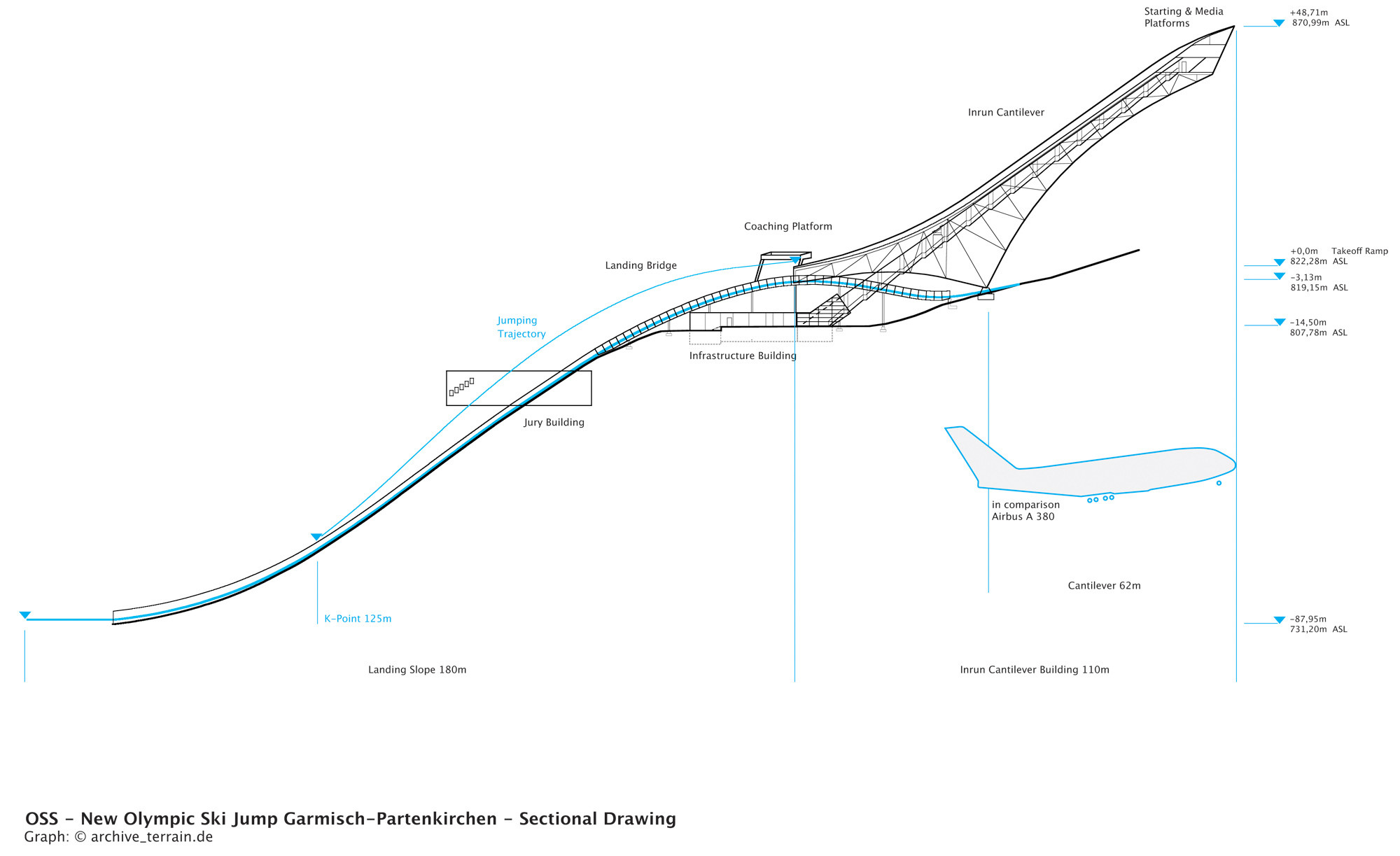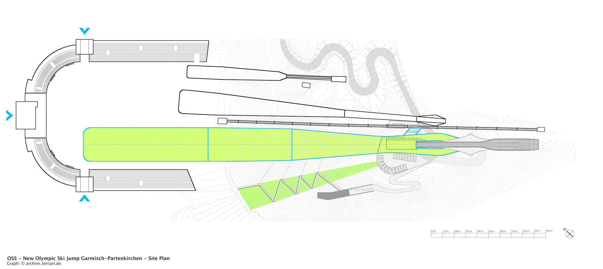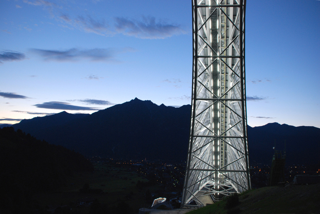 پرش اسکی المپیک در گارمیش-پارتنکیرشن یکی از مشهورترین امکانات در نوع خود است که به مدت 55 سال میزبان مسابقات پرش اسکی سال نو به عنوان بخشی از مسابقات بین المللی چهار تپه بوده است. اکنون، پس از نمایش اولیه در ژانویه 2008، مرکز جدید ورزشی پرش با اسکی المپیک، طراحی شده توسط افسر جوان مونیخ پروفسور کلاوس لونهارت و کریستوف مایر، معماران زمین: loenhart&mayr و معماران منظر، به طور رسمی در دسامبر سال جاری افتتاح خواهد شد. سال با توجه به ارتقای مورد نیاز پرش به استانداردهای فنی پیشرفته فدراسیون بین المللی اسکی (FIS)، ساخت یک پرش اسکی کاملاً جدید اجتناب ناپذیر بود. در میان پروژه‌های معماران زاها حدید، معماران Behnisch و دیگران، یک مسابقه بین‌المللی معماری در پاییز 2006 منجر به تصمیم‌گیری برای برپایی یک سازه کنسول به عنوان نقطه عطف جدید ورزش اسکی در دره گارمیش-پارتنکرشن شد. در طول طراحی پرش اسکی، زمین loenhart&mayr ofce از توپوگرافی محلی کوه Gudiberg الهام گرفت.