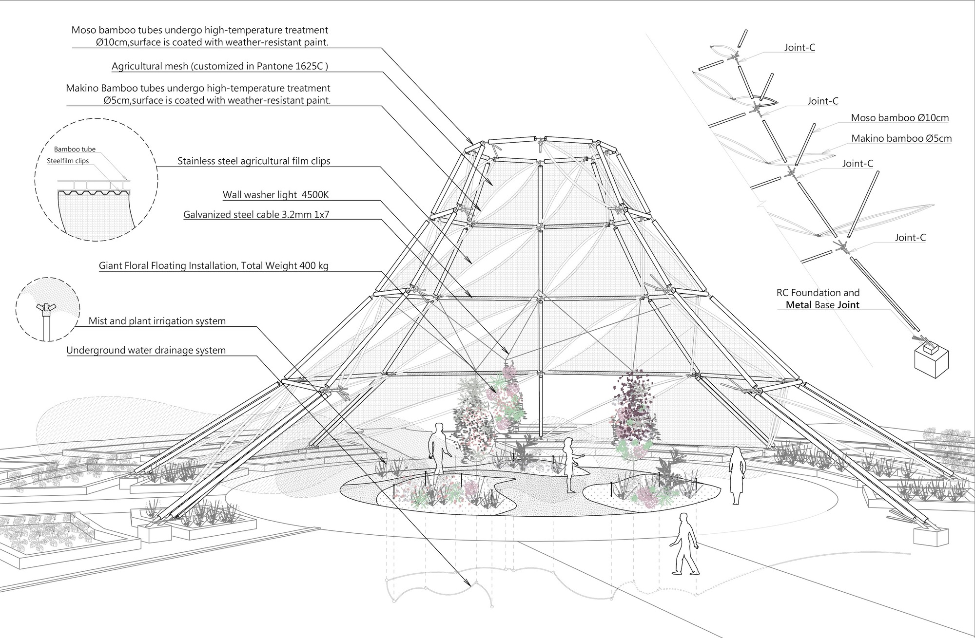 در گلخانه، جایی که نور خورشید و رطوبت به هم نزدیک می شوند، فضای مقدسی برای رشد گل ها و محصولات به وجود می آید. "Flourish" با الهام از مناظر روزمره گلخانه های کشاورزی در چانگوا، تایوان، دارای گنبدی با ساختار بامبو است. این اثر هنری از مواد کشاورزی مانند بامبو و مش کشاورزی استفاده می کند و هدف آن نشان دادن سرزندگی گل های شکوفه از طریق ساختارهای هندسی مدرن است. فضای داخلی گنبد فضاهای متنوعی از جمله جزایر شناور گل‌دار بزرگ، سیستم‌های آبیاری مه گلخانه‌ای، موسیقی الکترونیکی اصیل و هنر پیش‌نمایش را ارائه می‌دهد که قصد دارد فضای تازه‌ای از بهار را برای عموم به ارمغان بیاورد.