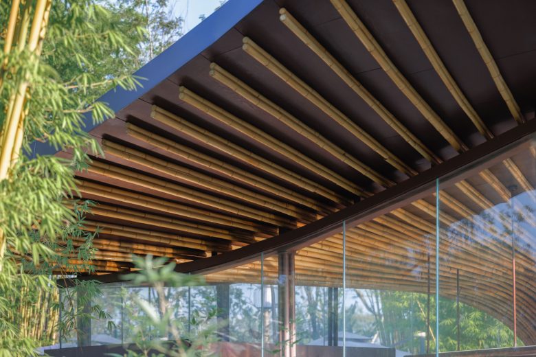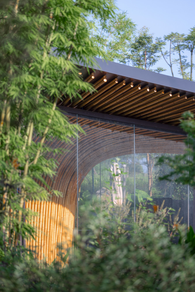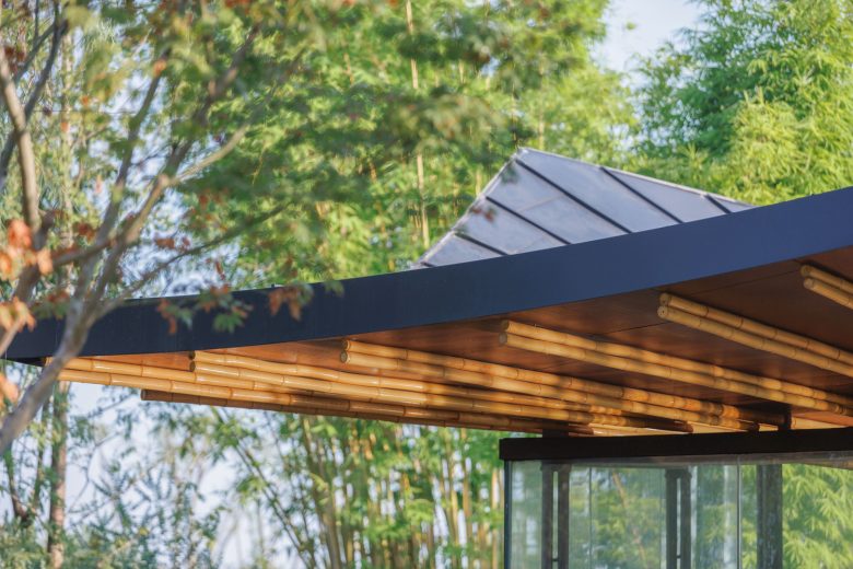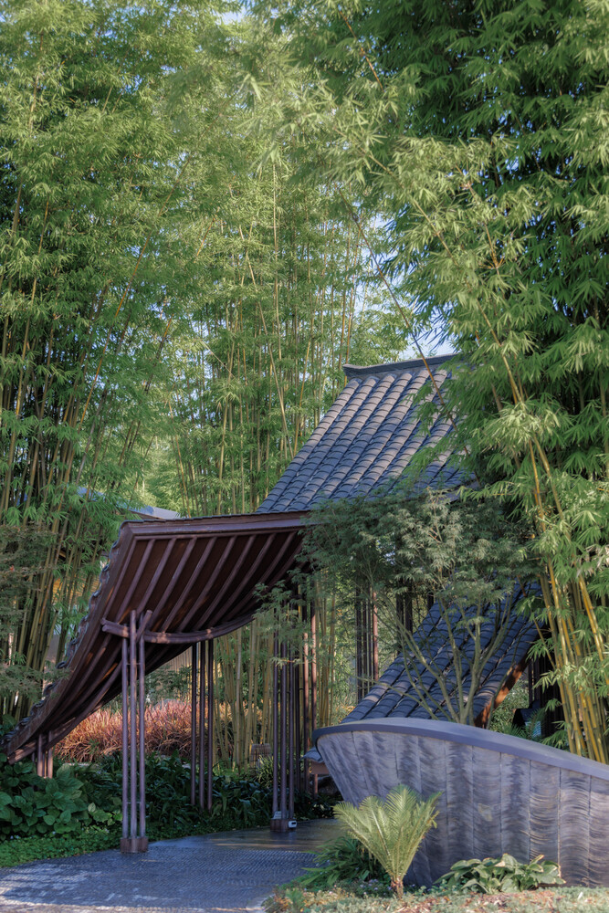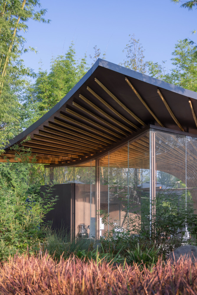طراحی کلی باغ نمایشگاه Xingcheng بر اساس باغ سیچوان غربی است که از سیستم فرهنگی سیچوان غربی نشات می گیرد. این منعکس کننده درک طبیعت، انسانیت و فضاهای زندگی توسط ساکنان این سرزمین است و احساسات هنری و فرهنگی مردم چنگدو و تفسیر آنها از "مسکن شاعرانه" را بیان می کند. آب جاری بامبو و نیلوفر آبی ساختمان اصلی نمایشگاه از اصل باغ اول پیروی می کند و معماری به عنوان یک ویژگی منظره است. امید است با ایجاد یک ساختمان چشم انداز شفاف، سبک، زیبا و هنرمندانه، این ساختمان به نقطه برجسته باغ نمایشگاه تبدیل شود. جنگل‌های بامبو و حوضچه‌های نیلوفر آبی رایج‌ترین و معرف عناصر منظر در باغ‌های سیچوان غربی هستند. در سالن نمایشگاه از تصویر "غرفه برگ نیلوفر آبی" استفاده شده است. این ساختمان مانند یک برگ بزرگ نیلوفر آبی در استخر است. توده ای از بامبو در زیر در همه جهات پخش می شود و قطب های بامبو به رگبرگ های برگ نیلوفر آبی تبدیل می شوند. سقف منحنی سبک. ویژگی‌های سبک و ظریف معماری خانه‌های محلی سیچوان غربی مانند سقف‌های شیب‌دار، کاشی‌های سبز کوچک، پیش‌روهای بلند و پیش‌مگه‌های نازک در یک هنر نمایشی و انتزاعی منعکس شده‌اند. به منظور تقویت این رنگ دراماتیک و رمانتیک، قسمت میانی برگ نیلوفر آبی توخالی شد و کل سقف برگ نیلوفر آبی به یک جمع کننده عظیم آب باران تبدیل شد که به موضوع اکسپو در قالب یک مقیاس بزرگ پاسخ می دهد. نصب هنری کف داخلی سالن نمایشگاه 0.6 متر فرو رفته است. وقتی بازدیدکنندگان می نشینند، خط دید آنها کمی بالاتر از سطح آب حوض است. آب و آسمان به یک رنگ هستند و می توانند مناظر زیبایی را که در آب منعکس شده است به تصویر بکشند. جنگل ها، مزارع، آب و خانه ها در سراسر ساختمان، چه در داخل و چه در خارج، در هم تنیده و یکپارچه شده اند. زمزمه بامبو از سال 2018، تیم Archermit در پروژه های مختلف معماری مرتبط با بامبو، کاوش و تحقیق گسترده در مورد مواد بامبو و فرهنگ بامبو مشارکت داشته است. طرح معماری "بامبو نیلوفر آبی" در نظر داشت از ساختار هیبریدی بامبو، ترکیبی از بامبو چند لایه و بامبو خام استفاده کند. با این حال، به دلیل محدودیت های زمانی و ملاحظات هزینه، در نهایت تیم مجبور به استفاده از یک سازه فولادی تکمیل شده با تزئینات خام بامبو برای این ساختمان شد. باغ های سیچوان غربی نه تنها برای اوقات فراغت و گشت و گذار هستند، بلکه اغلب دارای اهمیت معنوی و یادبود عمیقی هستند. امیدواریم این ساختمان کوچک با الهام از نیلوفر آبی و بامبو به بازدیدکنندگان این امکان را بدهد که پس از بازدید، معنای نمادین و روح درونی آن را درک کنند. هدف آن بیدار کردن یک حساسیت فرهنگی مشترک منحصر به فرد برای مردم چین است.