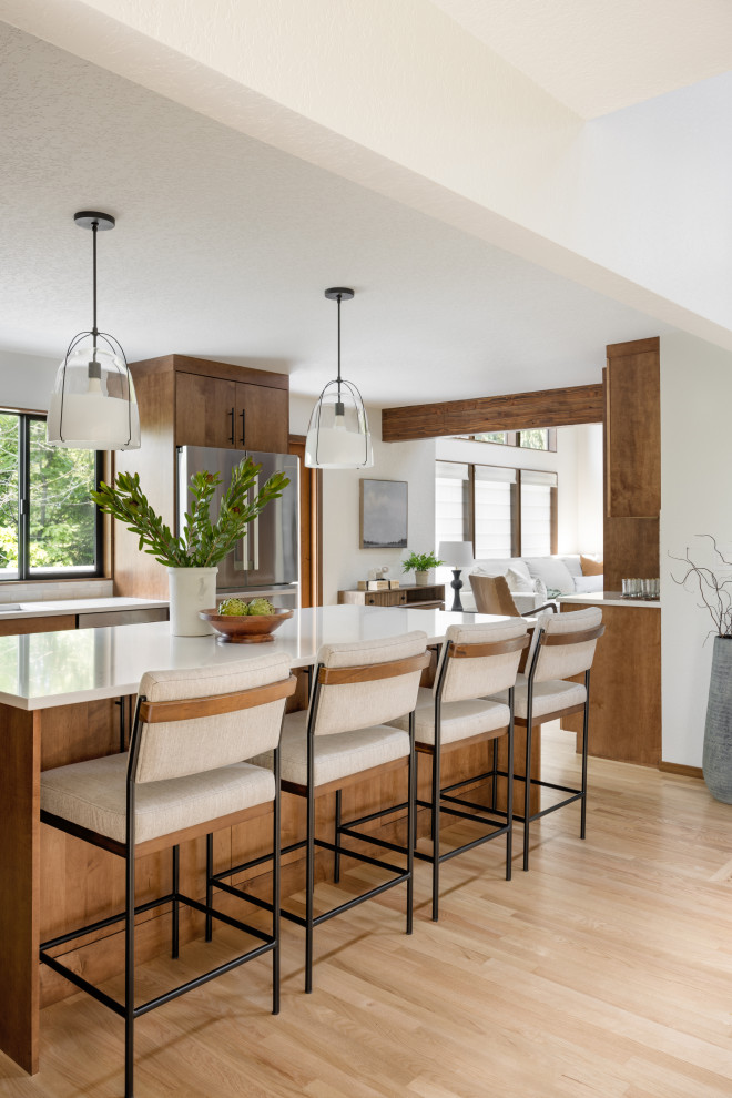 آشپزخانه‌ای روشن و معاصر با جزیره‌ای بزرگ و صفحه کوارتز سفید، کابینت‌های چوبی، چهار صندلی اپن با فریم فلزی و نور طبیعی فراوان.