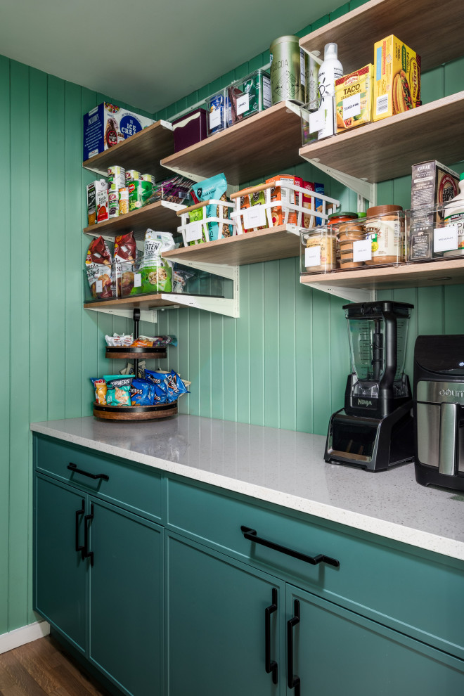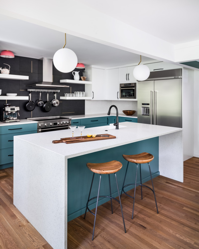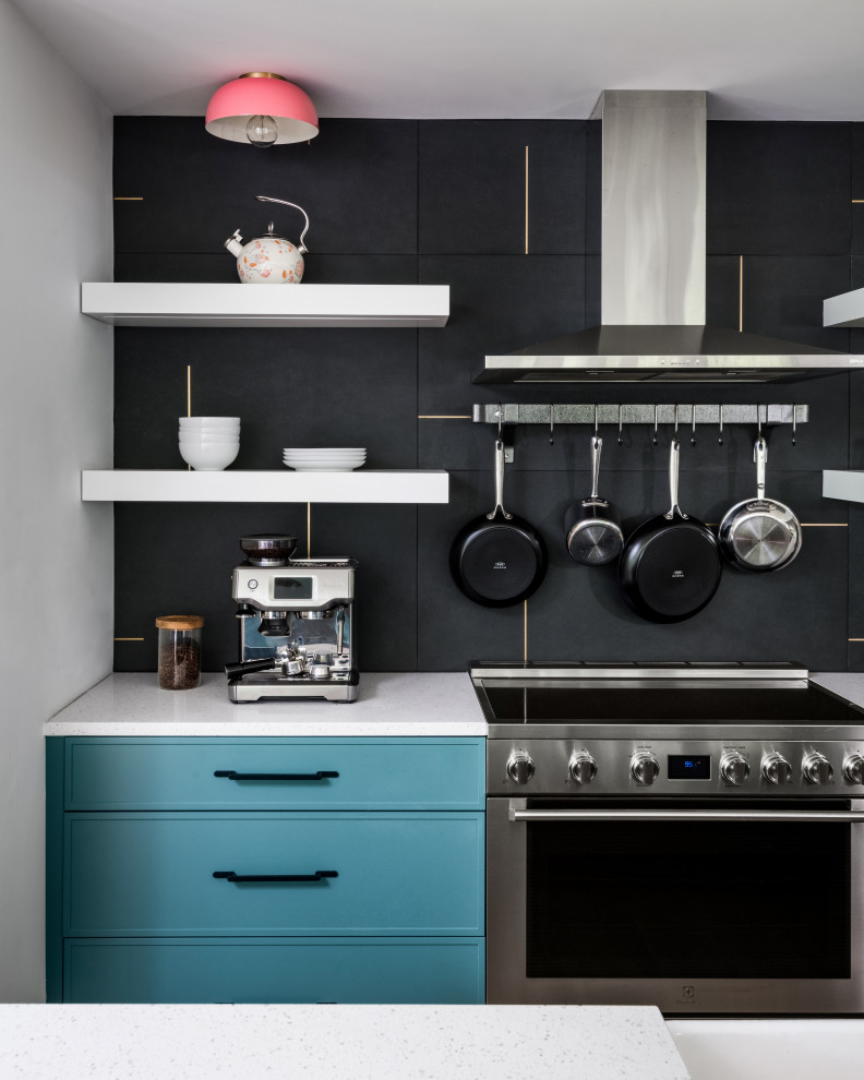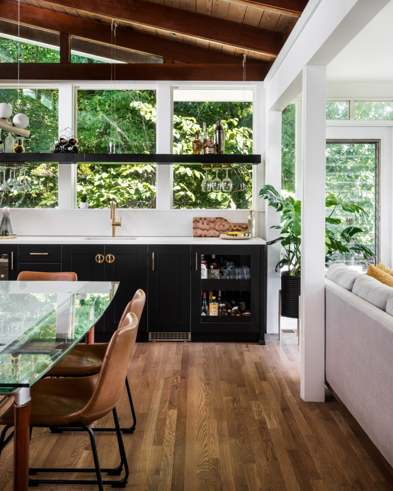 طراحی مدرن کابینت مشکی با دستگیره طلایی، قفسه معلق و نور طبیعی از پنجره‌های بزرگ؛ تلفیقی از زیبایی و کارایی در معماری داخلی