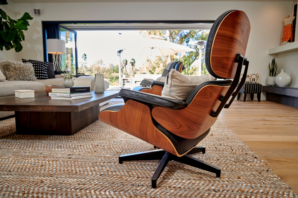 چیدمان مینیمال اتاق نشیمن با پنجره سرتاسری، مبل ال کرم، مبلمان چرمی و ارتباط مستقیم با فضای سبز بیرونی خانه مدرن