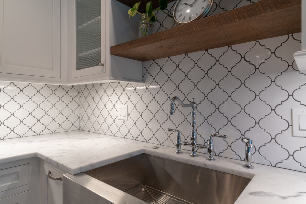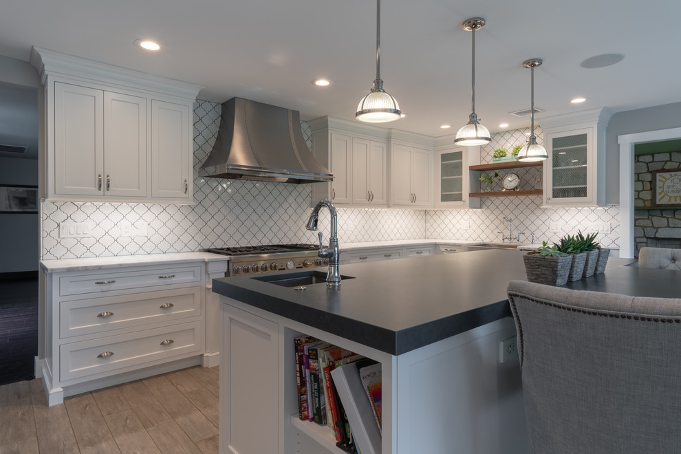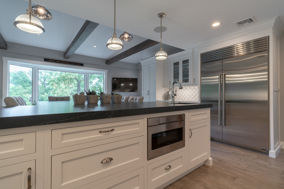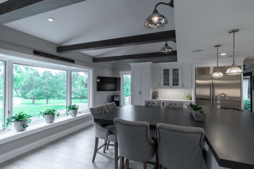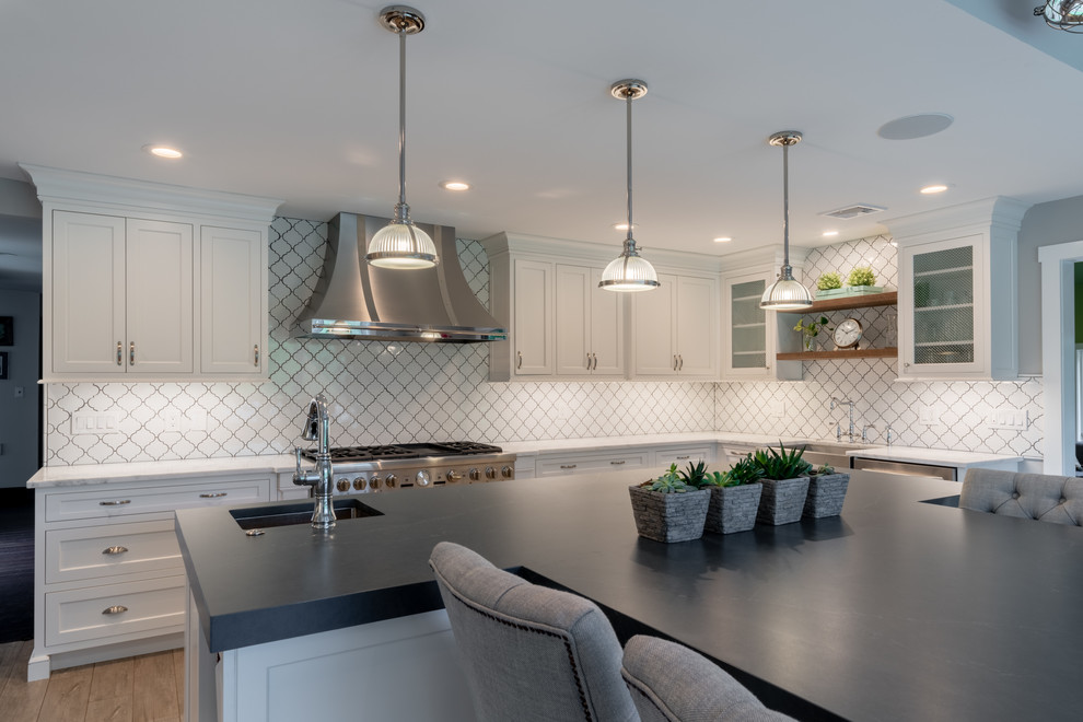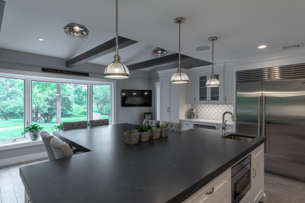 <p dir="rtl">این آشپزخانه شیک و مدرن با سبک روستایی دارای تیرها و قفسههایی از چوب بازیافتی است. جزیرهی بزرگ وسط آشپزخانه با سنگ گرانیت مشکی صیقلی پوشانده شده و دارای فضایی برای نشستن شش نفر، کشوی مایکروویو، قفسهای برای کتابهای آشپزی و مقدار زیادی فضای ذخیرهسازی است. </p><p dir="rtl">کابینتهای سفید و صفحههای روی پیشخوان از مرمر سفید، کنتراست جذابی با پیشخوان مشکی جزیره ایجاد کردهاند. لوازم استیل, سینک استیل و شیرآلات کروم نیز ظاهری صیقلی و مدرن به فضا بخشیدهاند.</p>