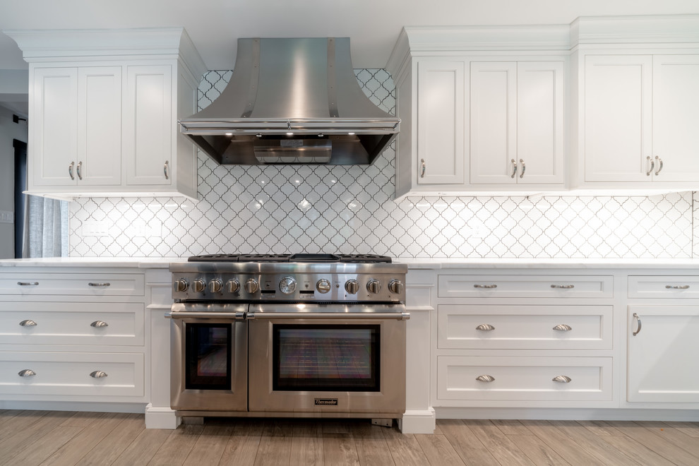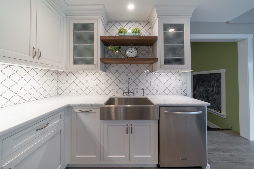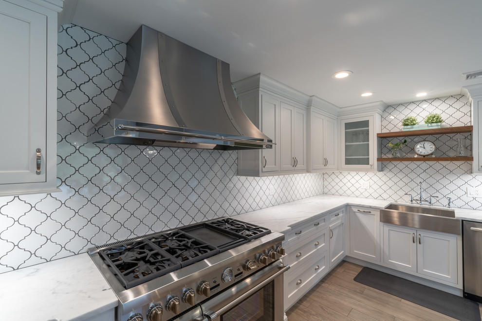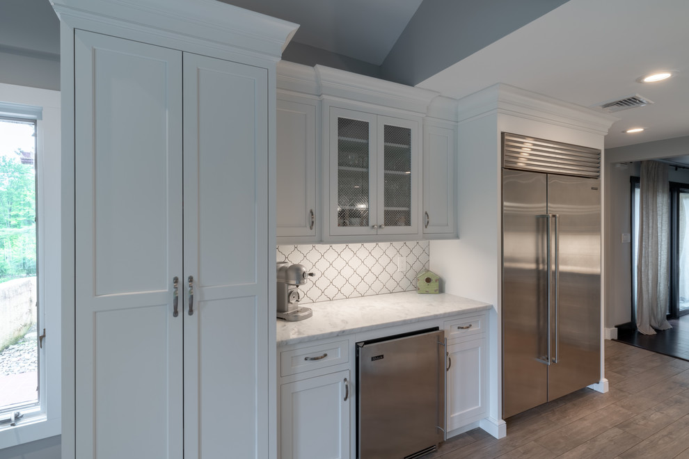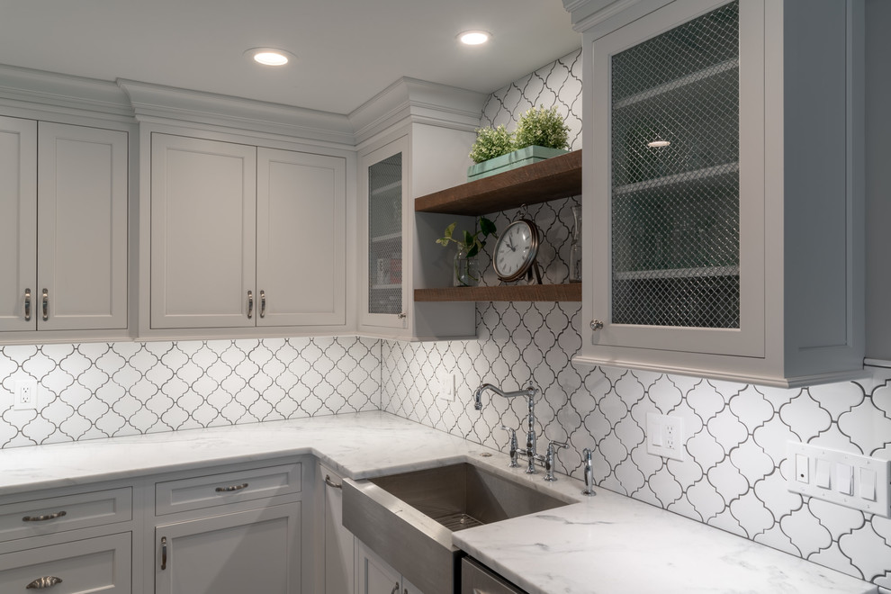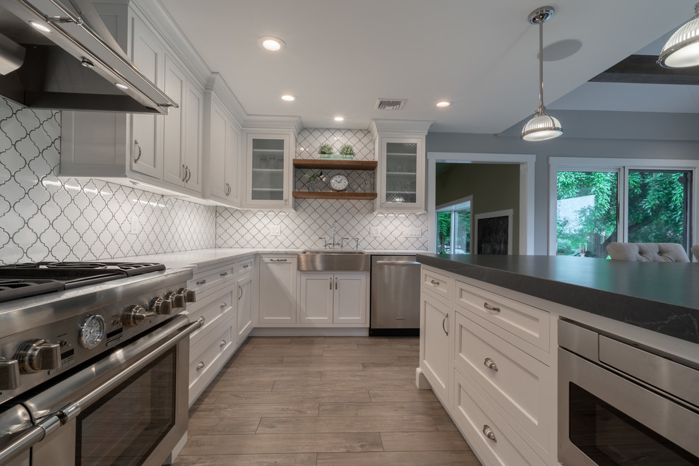 <p dir="rtl">این آشپزخانه شیک و مدرن با سبک روستایی دارای تیرها و قفسههایی از چوب بازیافتی است. جزیرهی بزرگ وسط آشپزخانه با سنگ گرانیت مشکی صیقلی پوشانده شده و دارای فضایی برای نشستن شش نفر، کشوی مایکروویو، قفسهای برای کتابهای آشپزی و مقدار زیادی فضای ذخیرهسازی است. </p><p dir="rtl">کابینتهای سفید و صفحههای روی پیشخوان از مرمر سفید، کنتراست جذابی با پیشخوان مشکی جزیره ایجاد کردهاند. لوازم استیل, سینک استیل و شیرآلات کروم نیز ظاهری صیقلی و مدرن به فضا بخشیدهاند.</p>