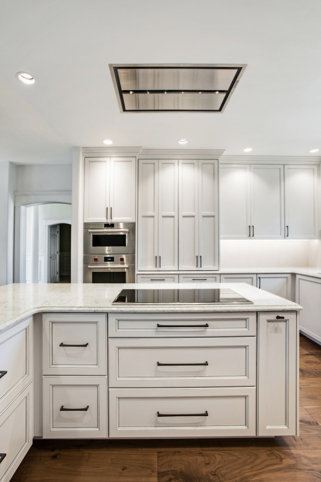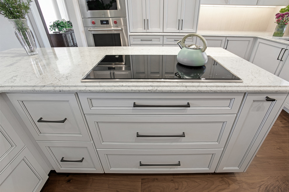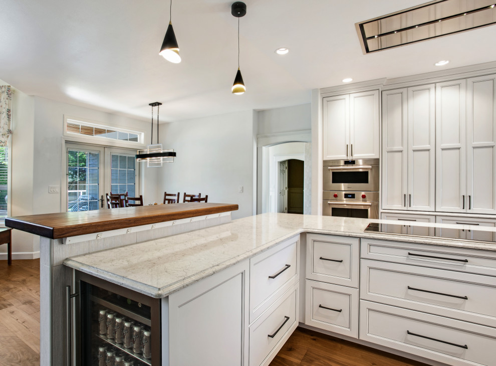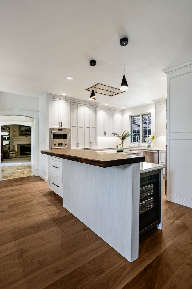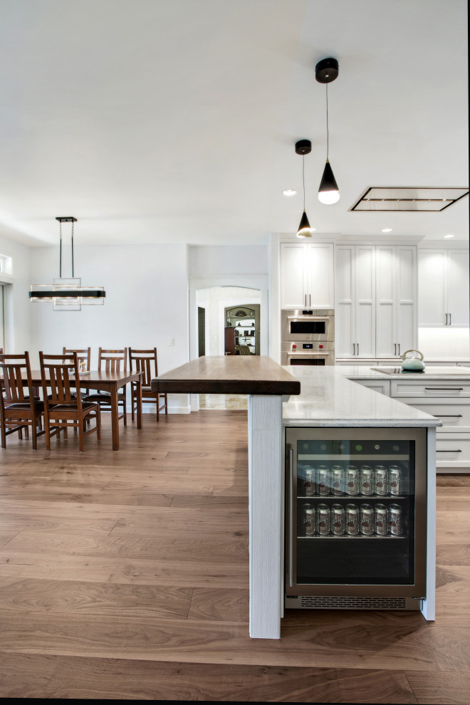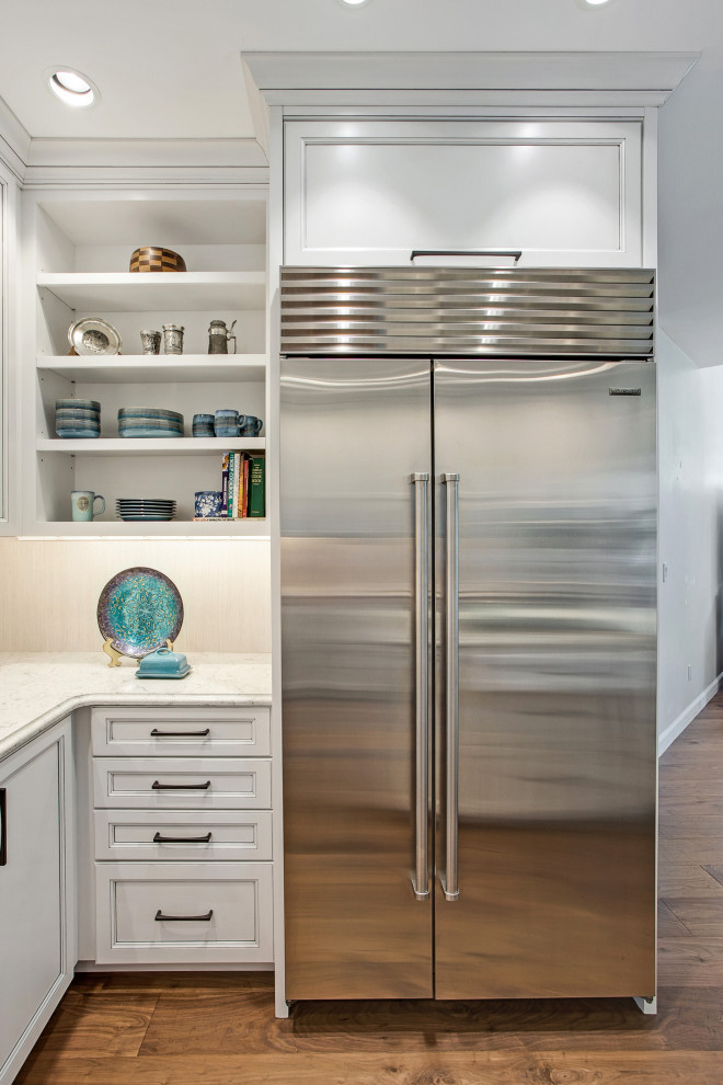 یخچال نوشیدنی توکار با درب شیشه‌ای و بدنه استیل، یکپارچه با جزیره آشپزخانه مدرن و کابینت‌های سفید کلاسیک