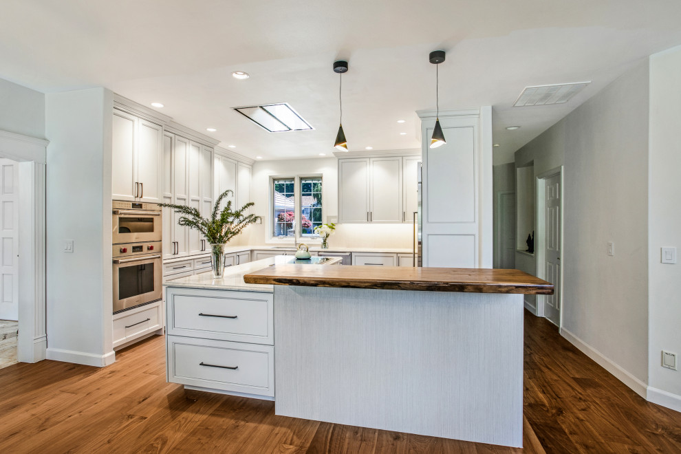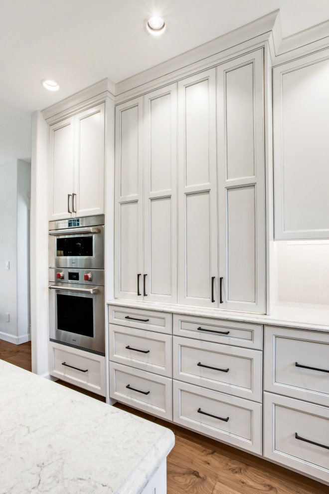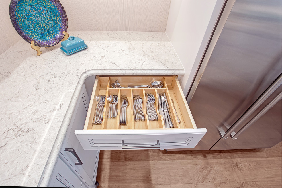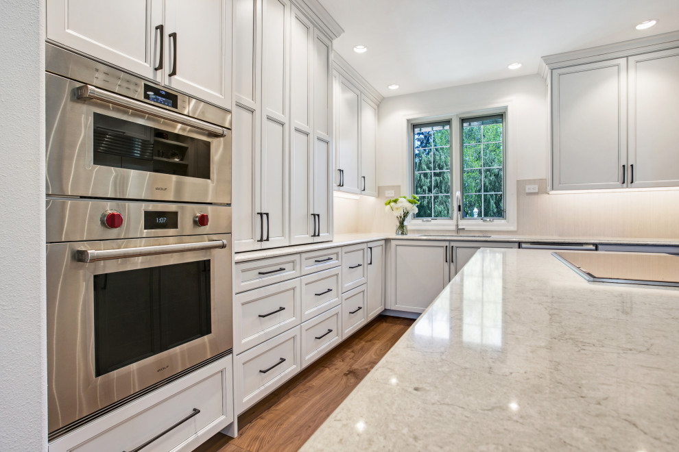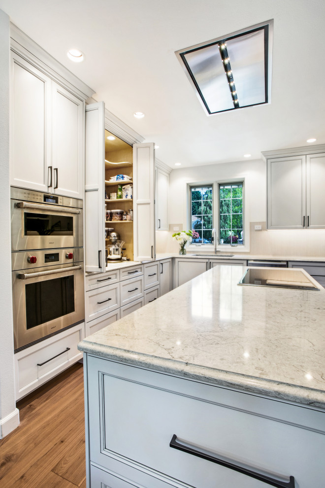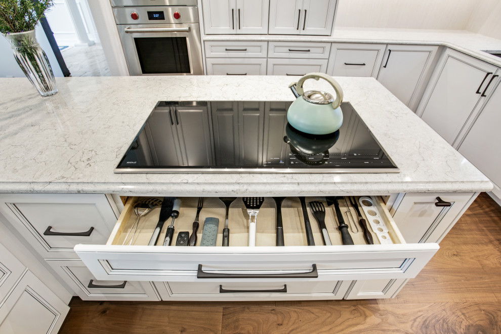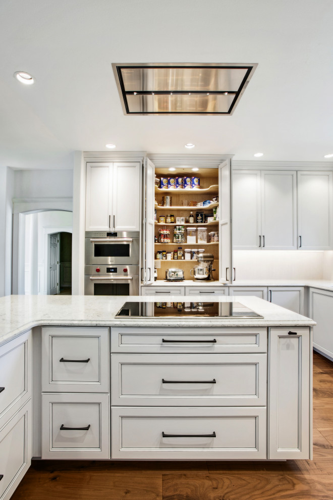 یخچال نوشیدنی توکار با درب شیشه‌ای و بدنه استیل، یکپارچه با جزیره آشپزخانه مدرن و کابینت‌های سفید کلاسیک