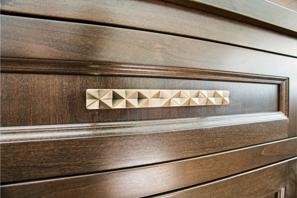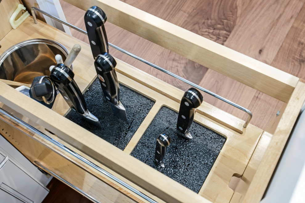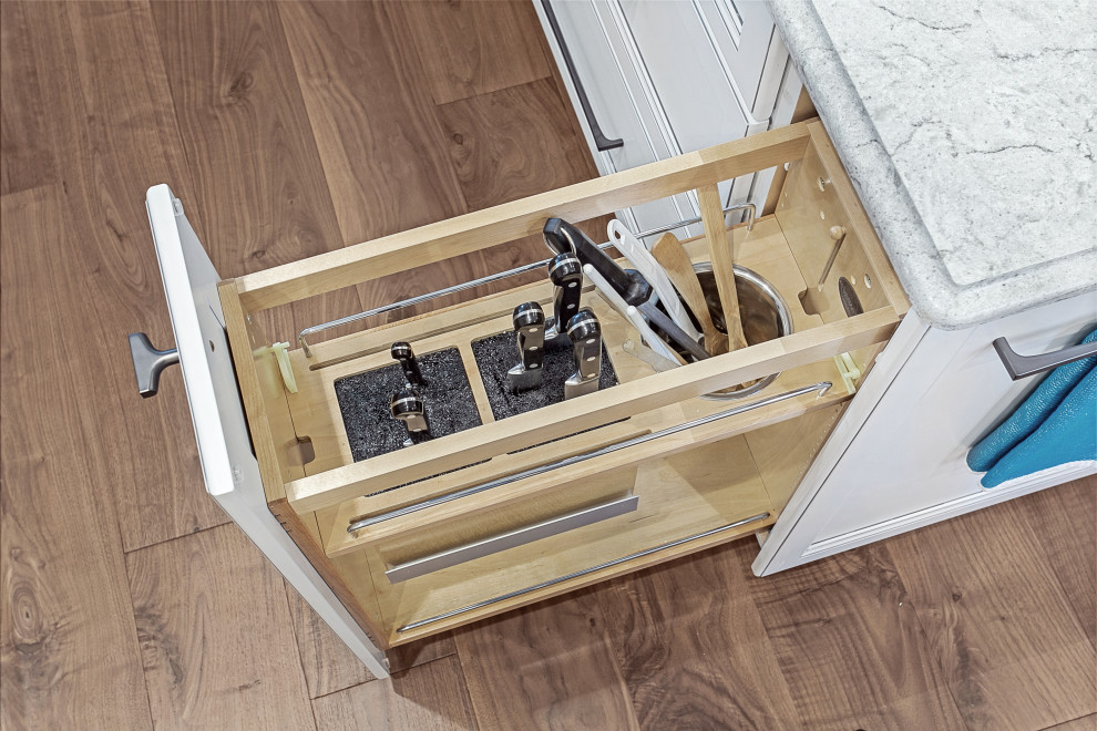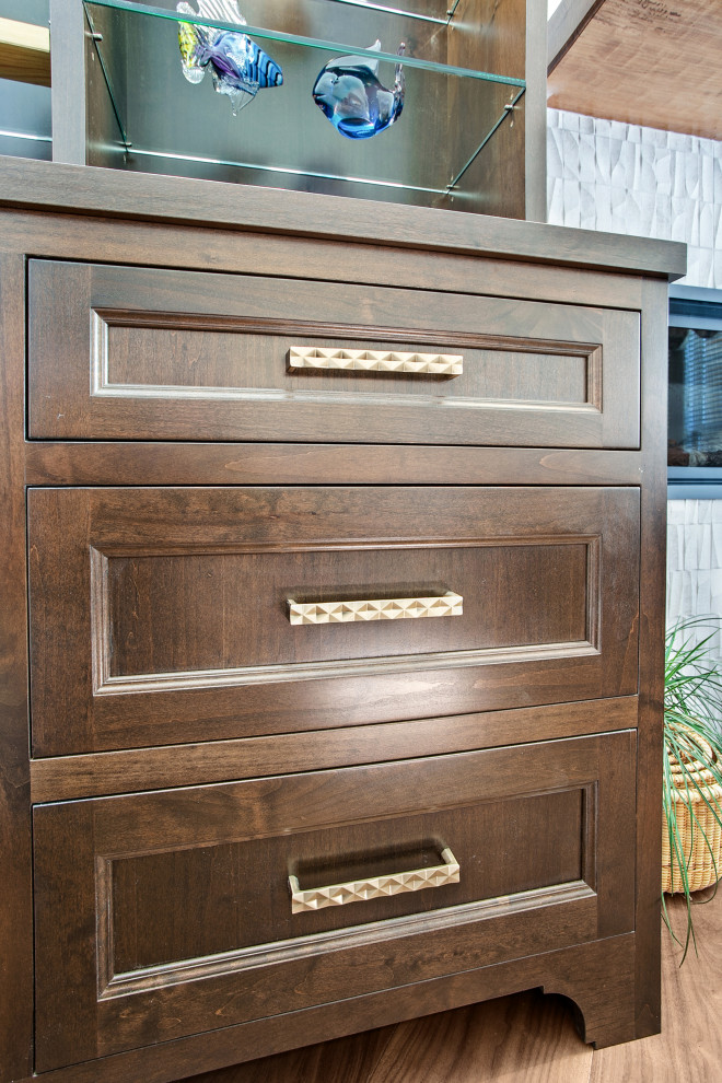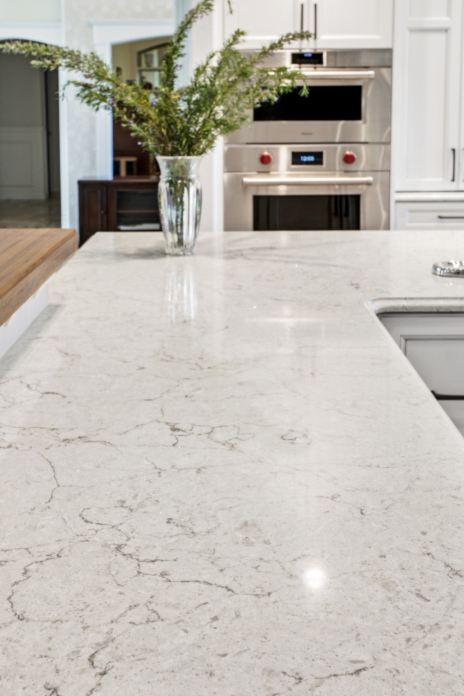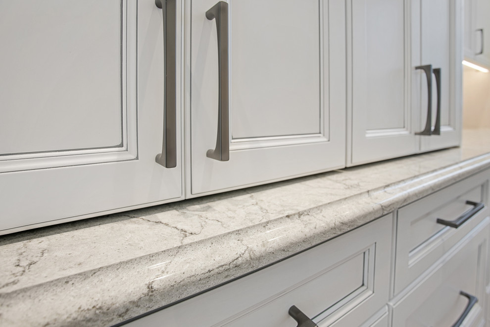 یخچال نوشیدنی توکار با درب شیشه‌ای و بدنه استیل، یکپارچه با جزیره آشپزخانه مدرن و کابینت‌های سفید کلاسیک